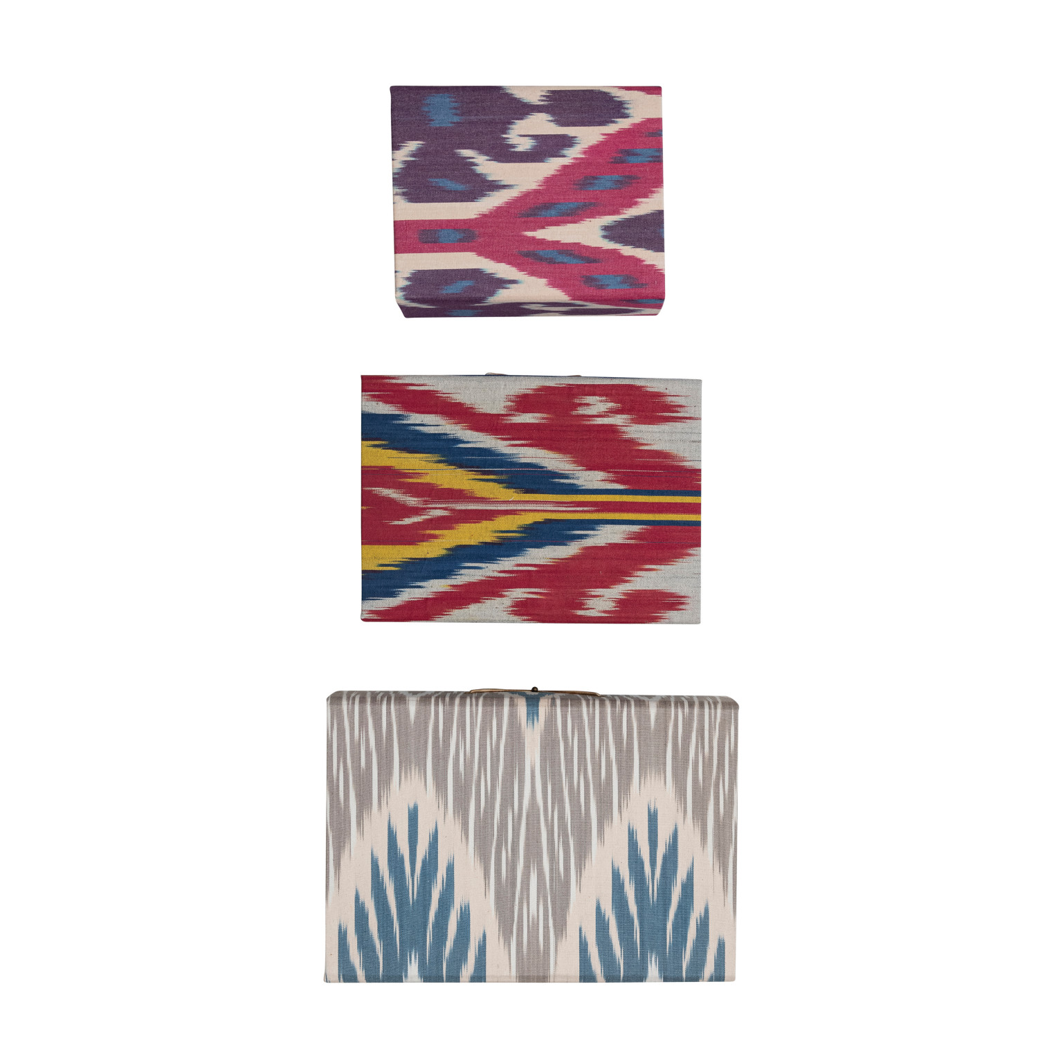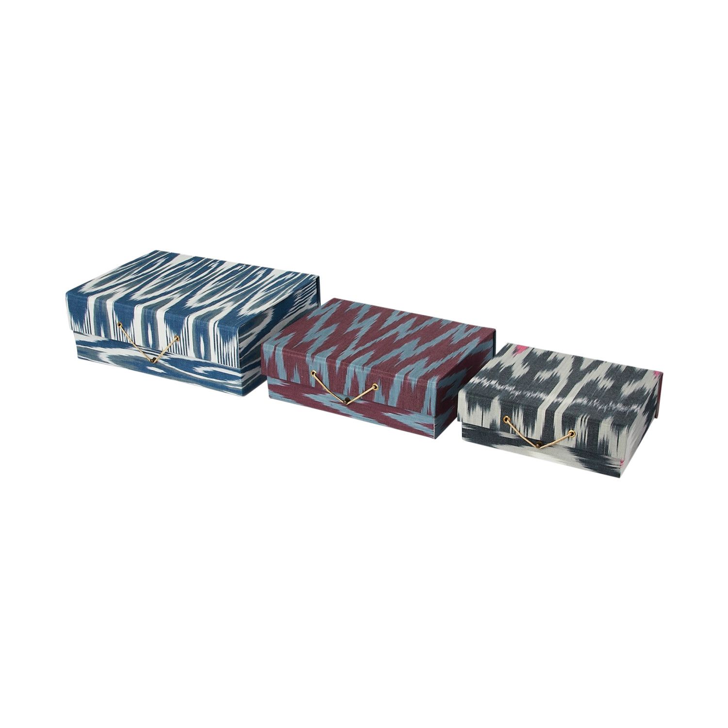 Curate an elegant, storied space with our thoughtfully crafted collection of decorative boxes, bins, and baskets, designed to transform clutter. Peruse a vast selection of unique, display-worthy pieces created to stylishly streamline a space of any design scheme, including woven baskets, hanging baskets, trays, display boxes, jewelry boxes, trunks, lidded containers, and so much more. Choose from a wide array of materials from reclaimed wood and paper mache to genuine horn and ceramic, and styles from mid-century modern and coastal to classic farmhouse and cottage. Elegantly stow unsightly odds and ends, or display treasured trinkets with decorative storage that is sure to impress. This boho-inspired set of storage boxes features three bold patterns and sizes. Display in a living space of any style from global to boho. Add a touch of personal style to a mantelpiece or console table with this set of decorative boxes. Made from paper and cotton.