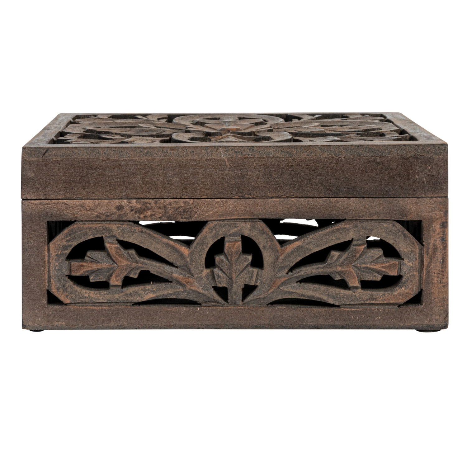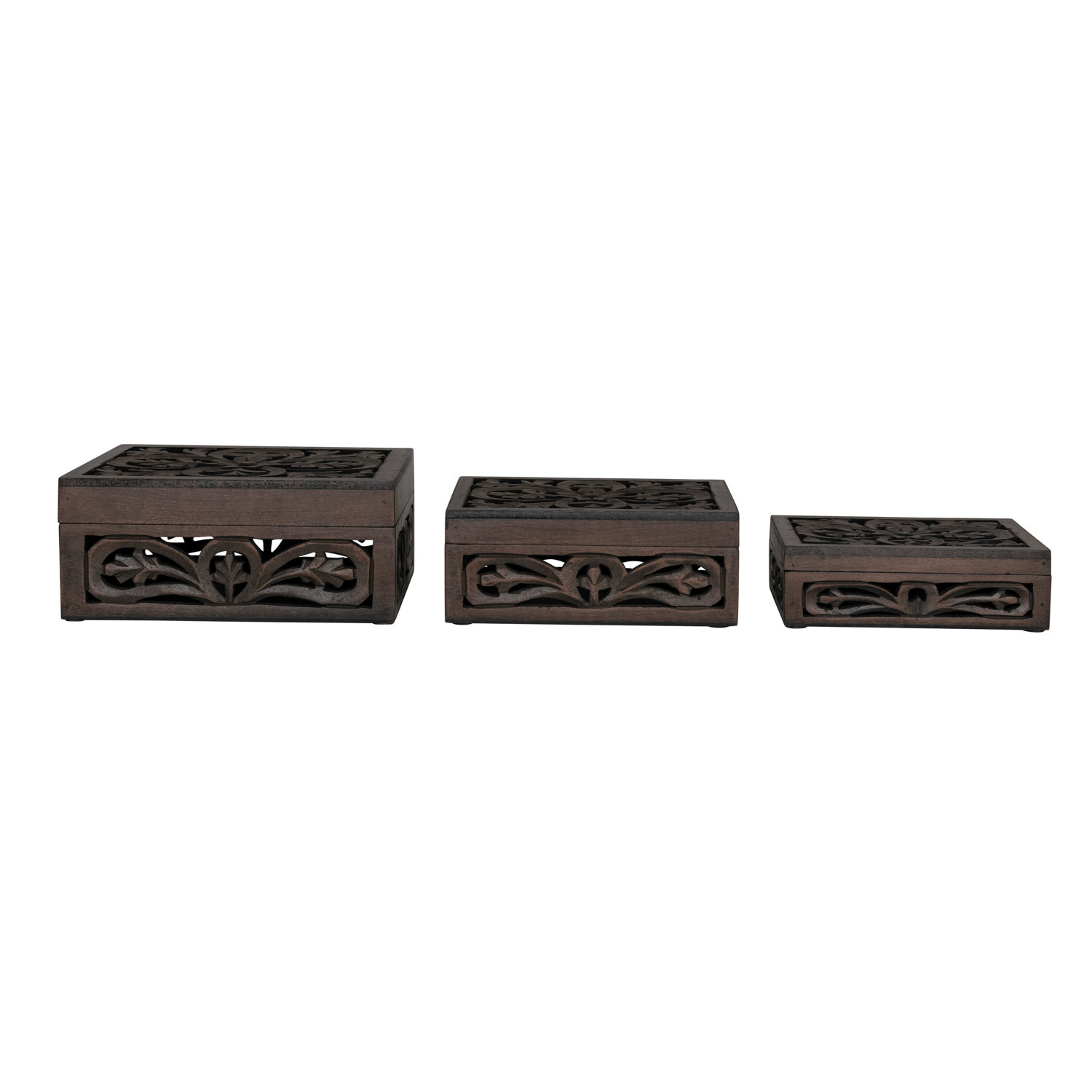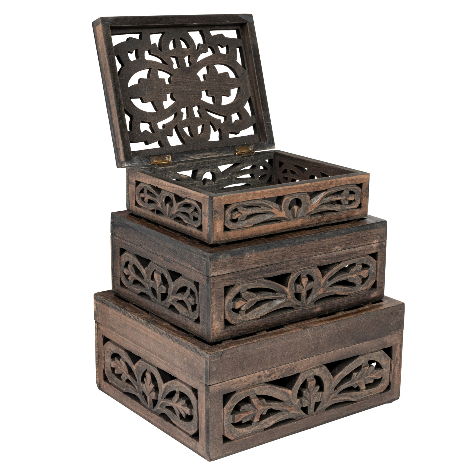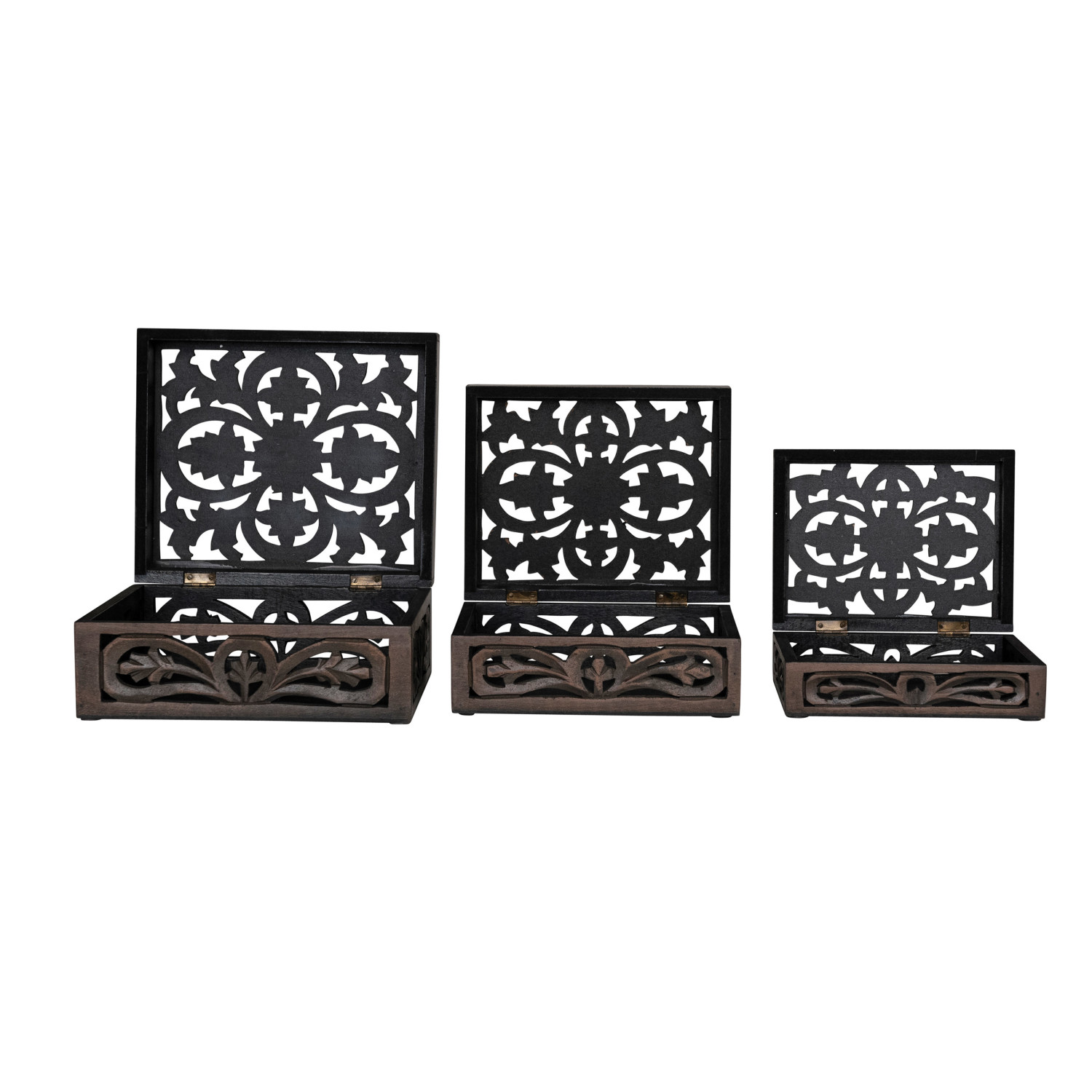 Catalog Name: 11"L x 9-1/2"W x 5"H, 9-3/4"L x 8"W x 4"H & 8-3/4"L x 6-3/4"W x 3"H Carved MDF & Mango Wood Nesting Boxes w/ Design, Espresso Finish, Set of 3
