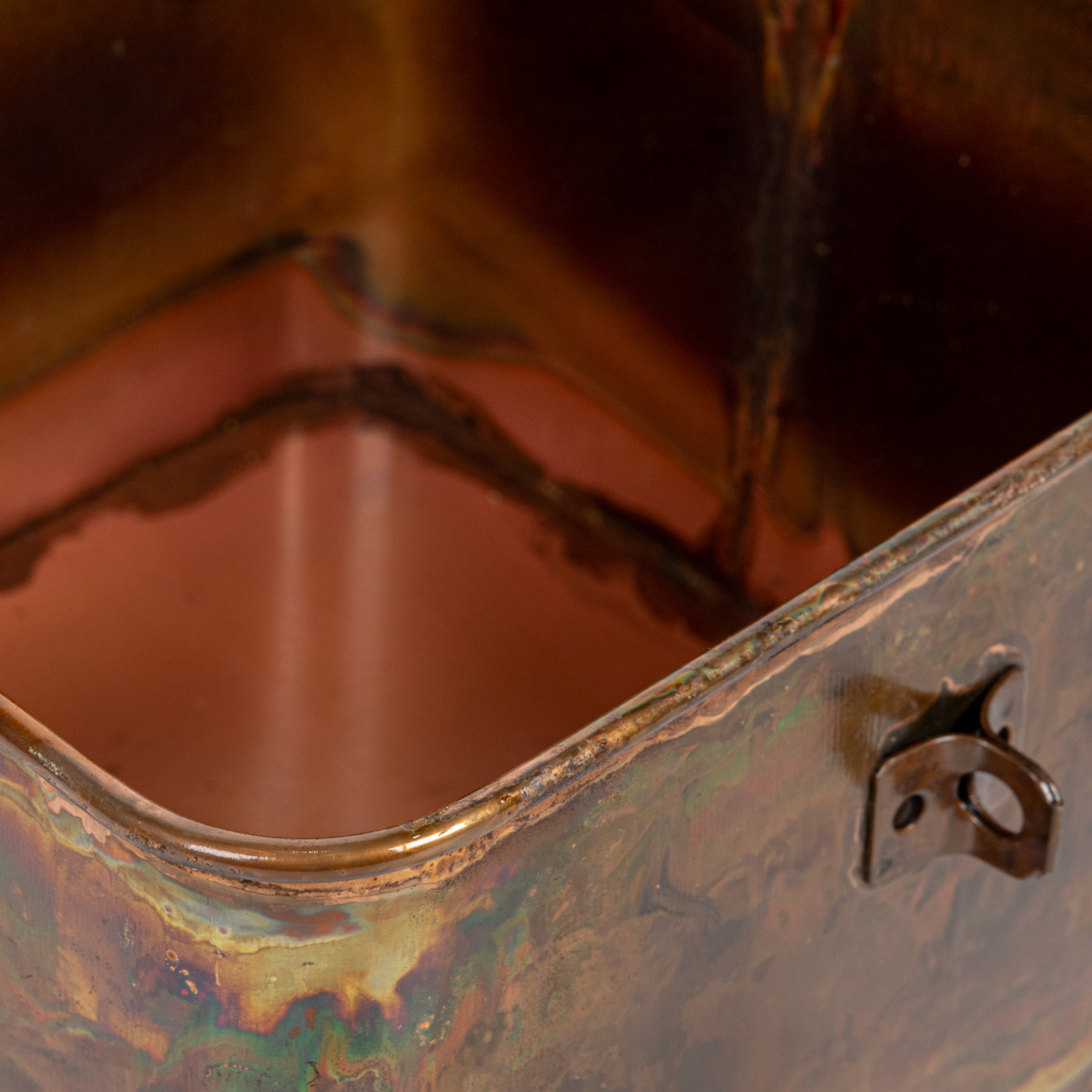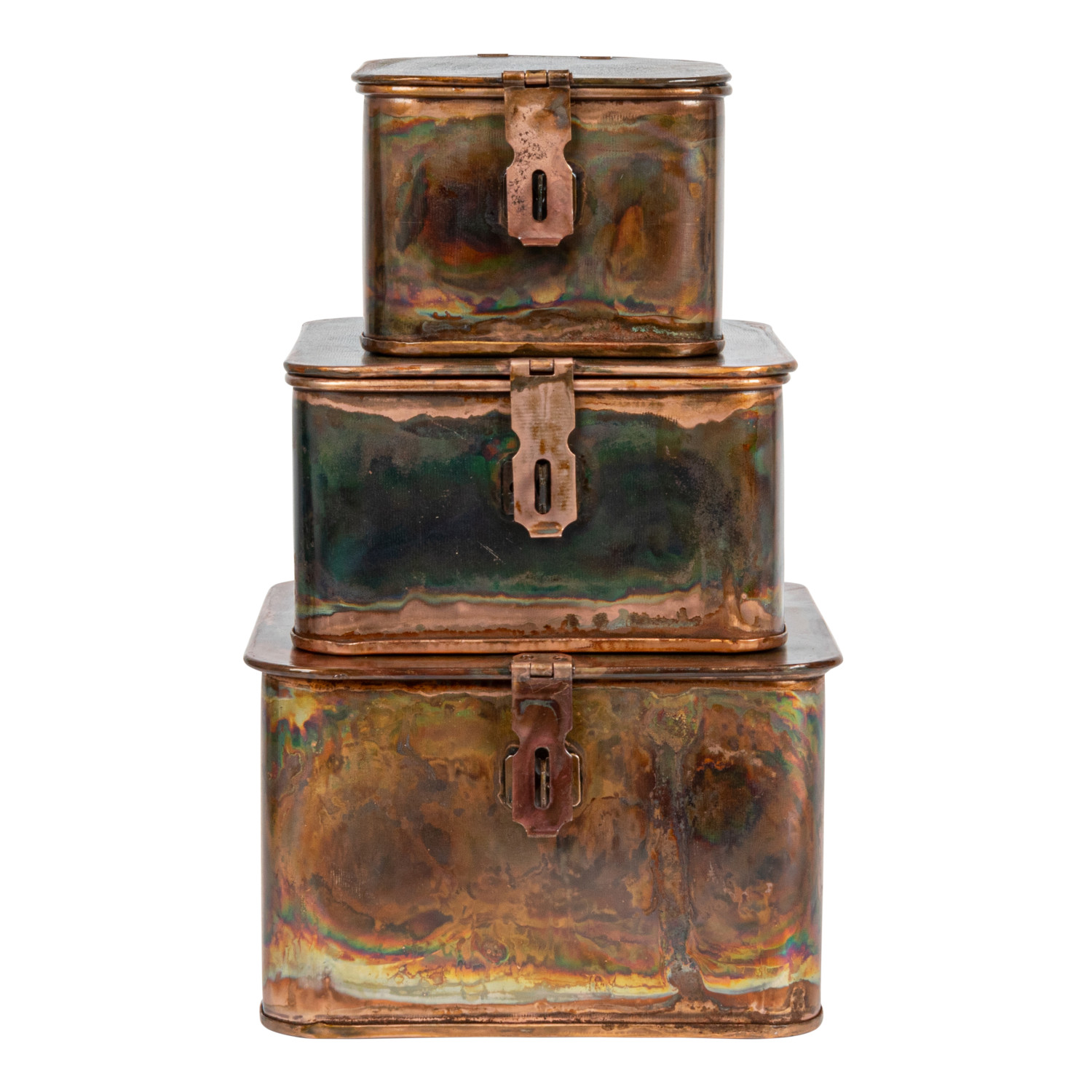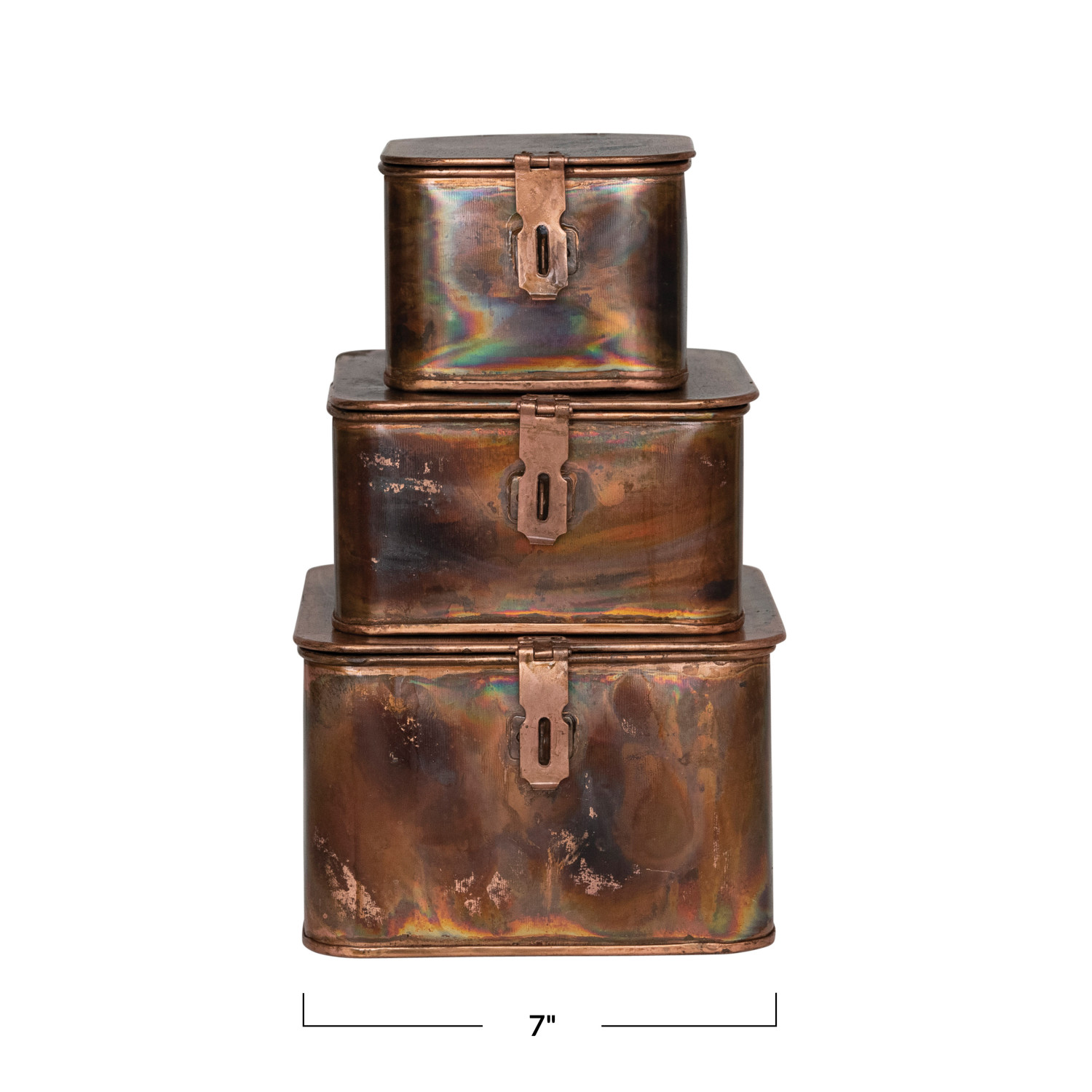 Add a touch of rustic elegance to any space with this set of three burnt copper metal boxes with lids and latches. These metal boxes have lids and latches that can be locked with a padlock or a key for extra security. The boxes have a stunning burnt copper finish, giving them a warm and sophisticated look. The boxes come in three sizes that can fit small trinkets, jewelry, or keepsakes. Display these boxes on a shelf, table, or dresser to add farmhouse, industrial, or eclectic flair to any space. The boxes measure 7 inches square, 6 inches square, and 4.5 inches square. This set of three burnt copper metal boxes with lids and latches is a stylish and secure storage solution that will enhance the beauty and style of the home. Order this today and enjoy a stylish and practical addition to any home. A set of three metal boxes with lids and latches that have a stunning burnt copper finish that exudes warmth and sophistication. Perfect for farmhouse, industrial, or eclectic style homes. A stylish and secure storage solution for small trinkets, jewelry, or keepsakes; can be displayed on a shelf, table, or dresser. Made of metal with a burnt copper finish that gives them a rustic and elegant look.