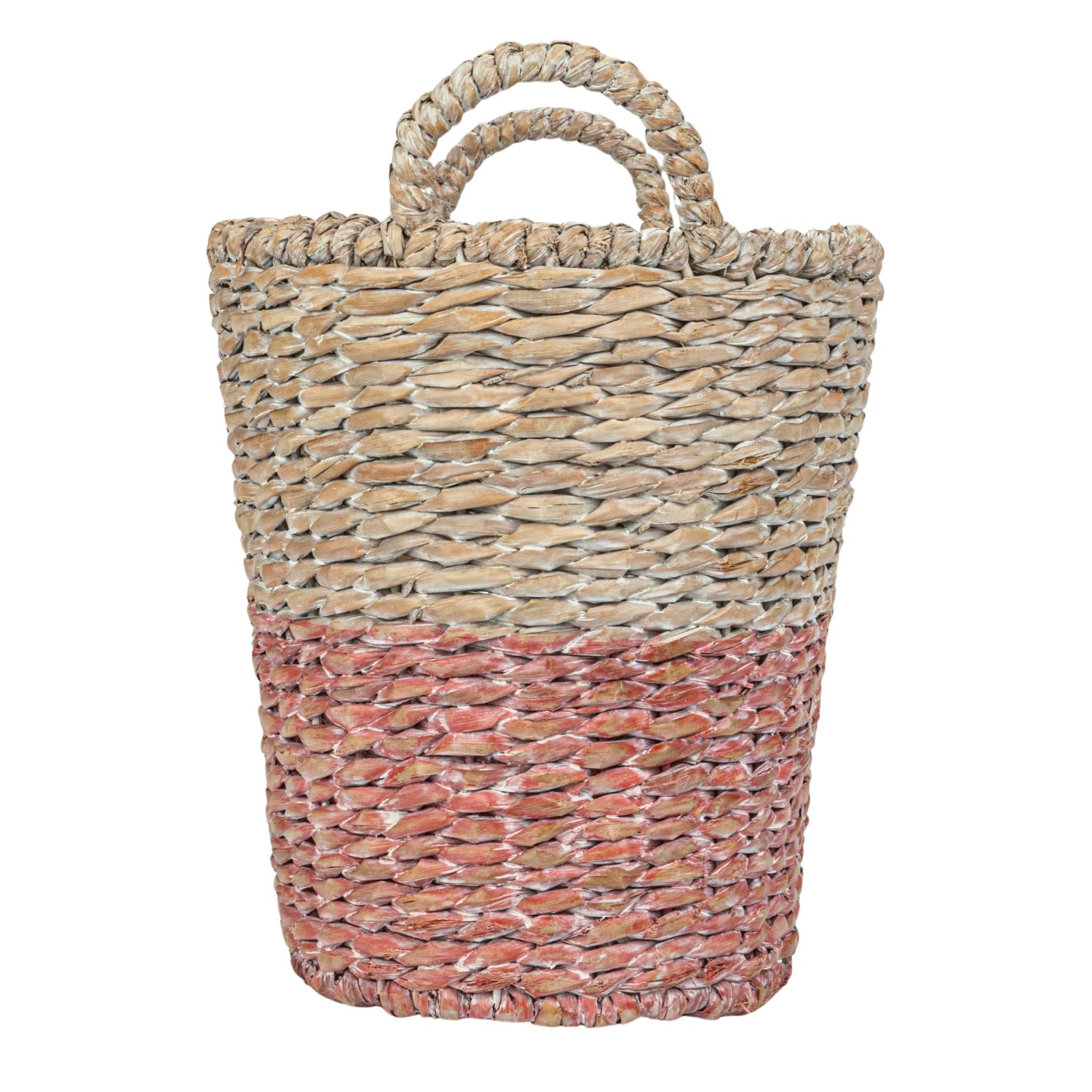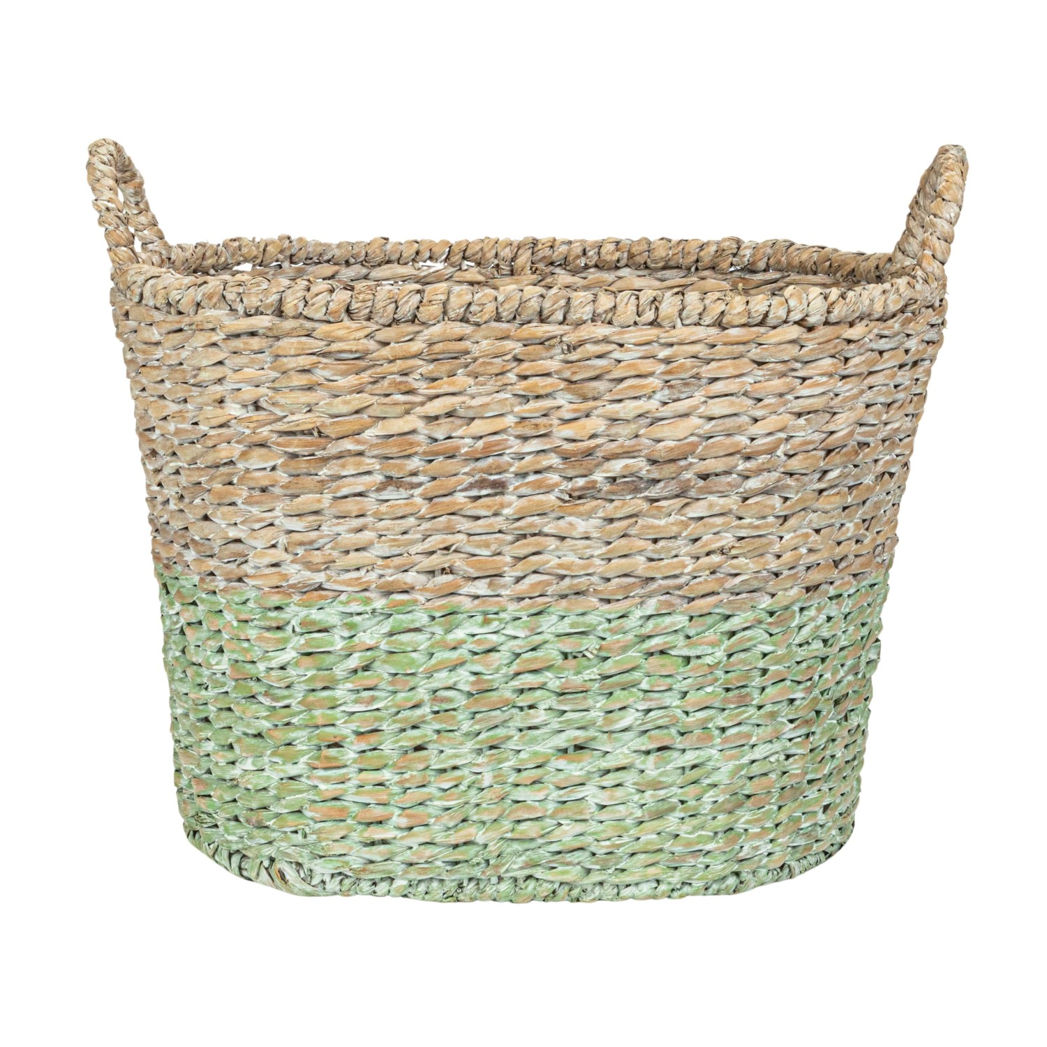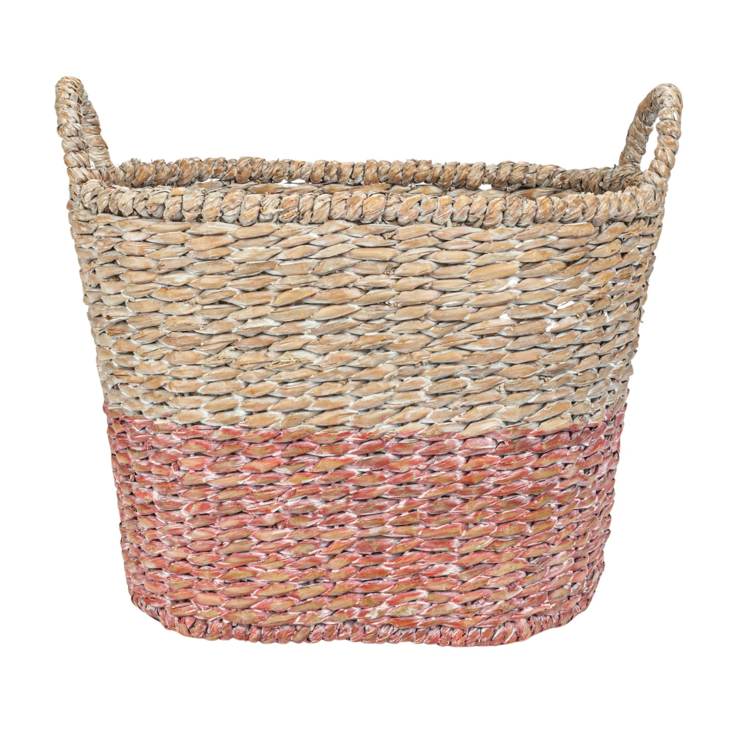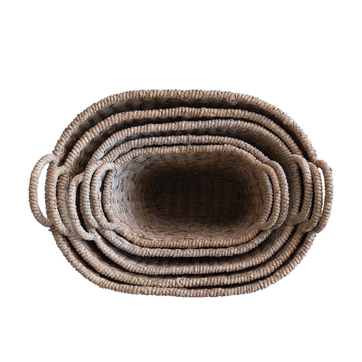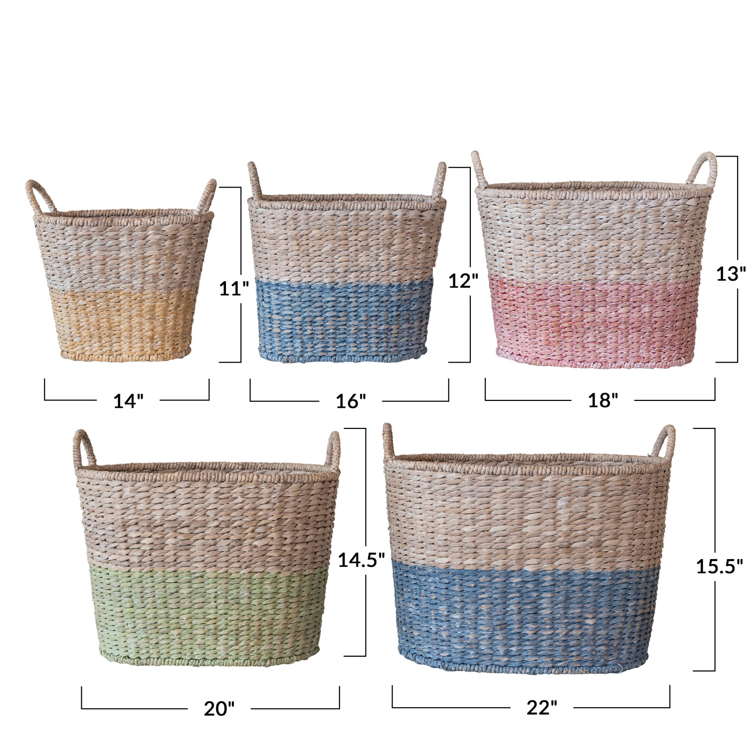 Catalog Name: 22"L x 16"W x 15-1/2"H, 20"L x 14-1/2"W x 14-1/2"H, 18"L x 12"W x 13"H, 16"L x 10"W x 12"H & 14"L x 8"W x 11"H Oval Woven Water Hyacinth & Rattan Dip Dyed Baskets w/ Handles, Multi Color, Set of 5