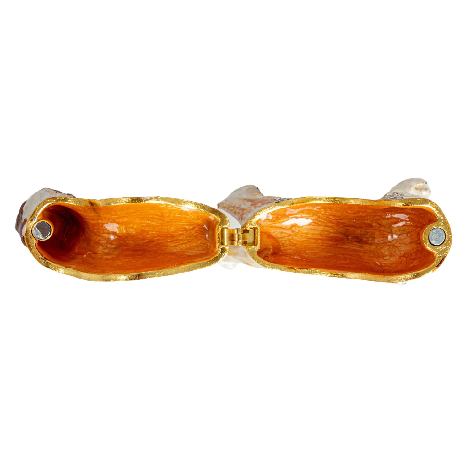 Catalog Name: 3"L x 1-1/4"W x 2"H Enameled Metal Pug Shaped Trinket Box w/ Jewels, Gold Finish, Brown & White