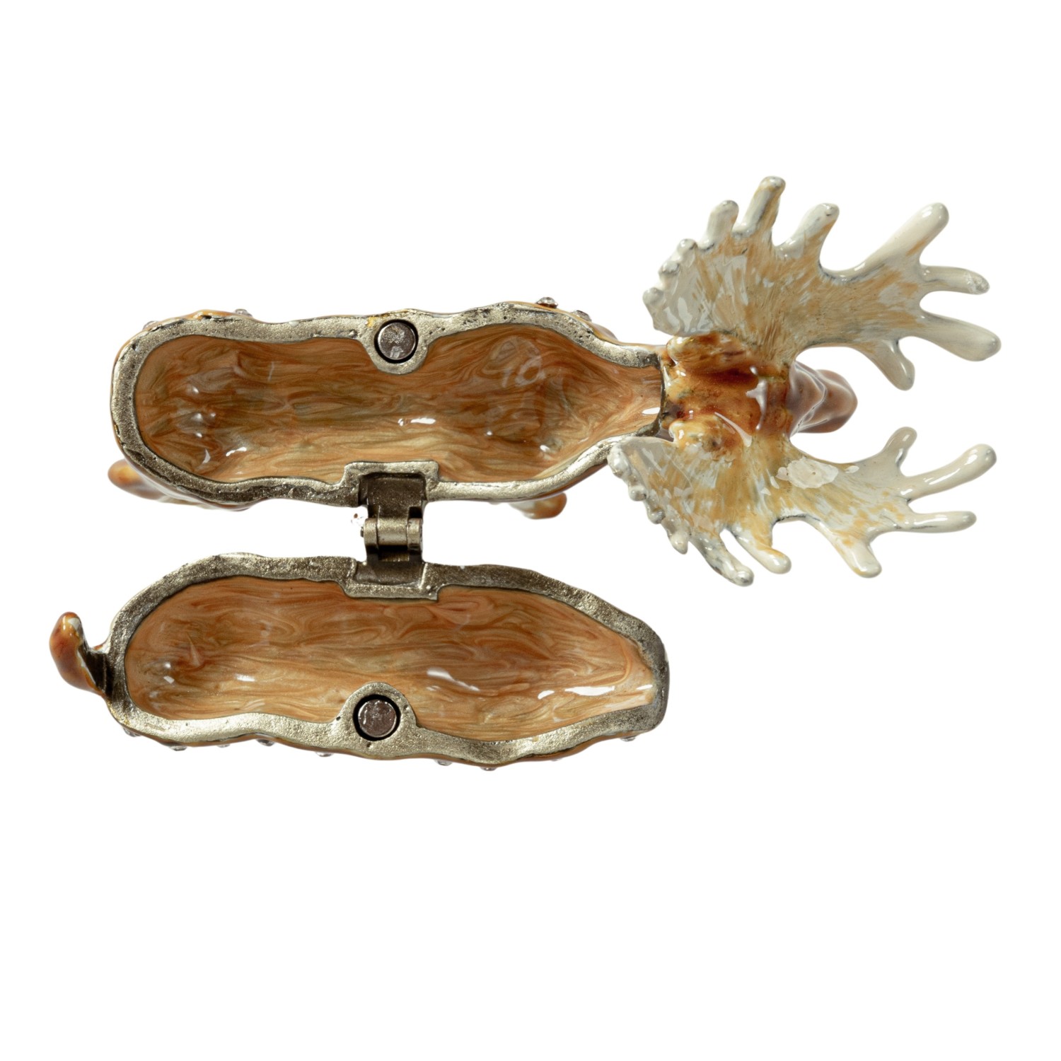 Catalog Name: 3-1/2"L x 1-1/2"W x 2-3/4"H Enameled Metal Moose Shaped Trinket Box w/ Jewels, Brown & Tan Color