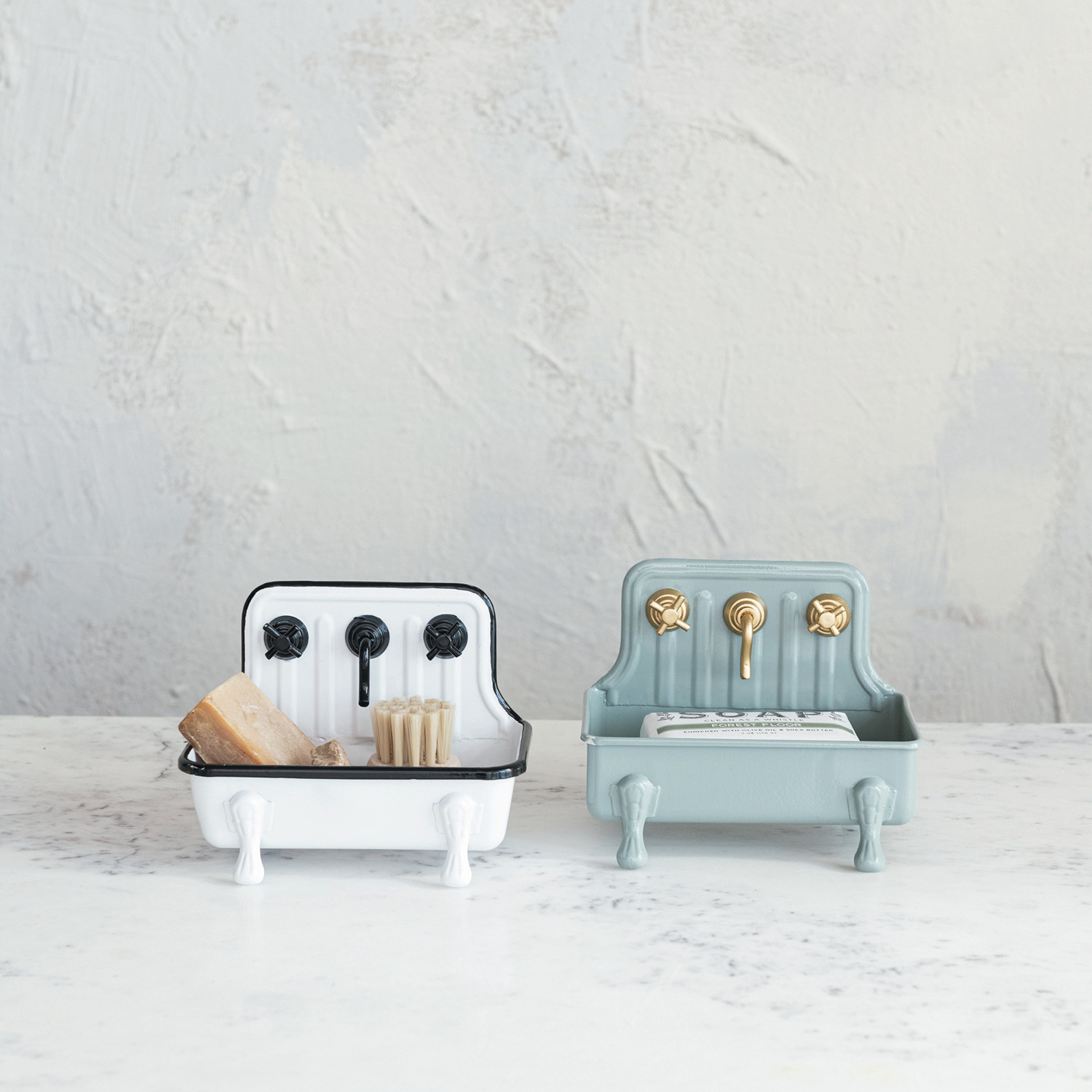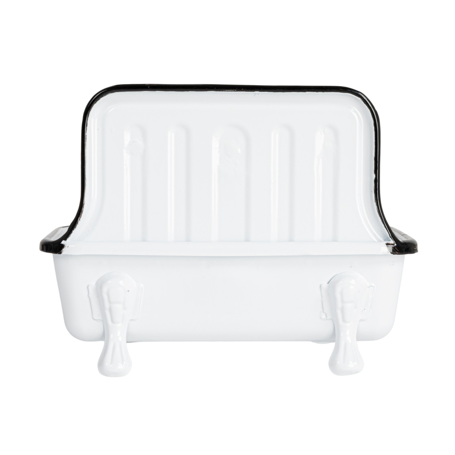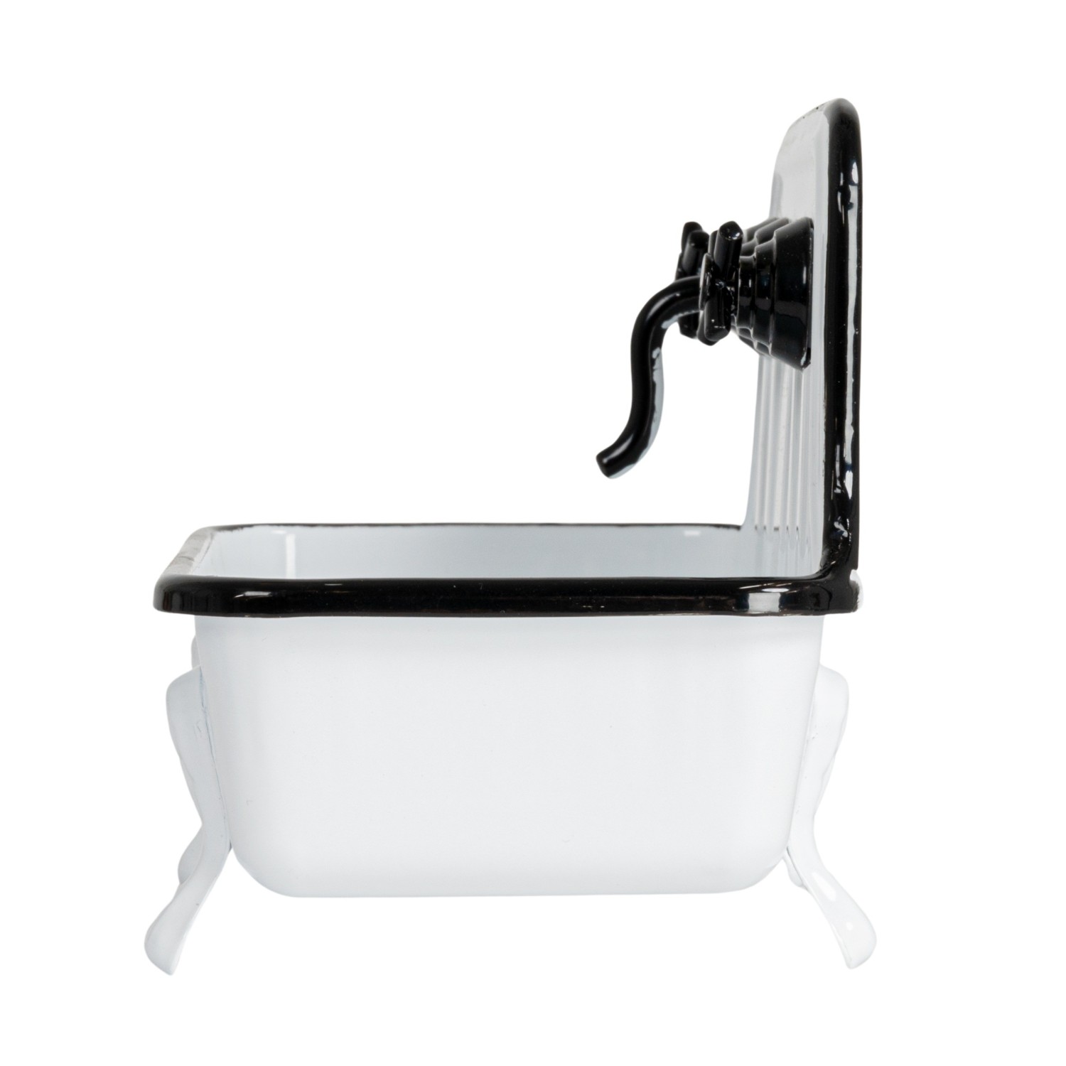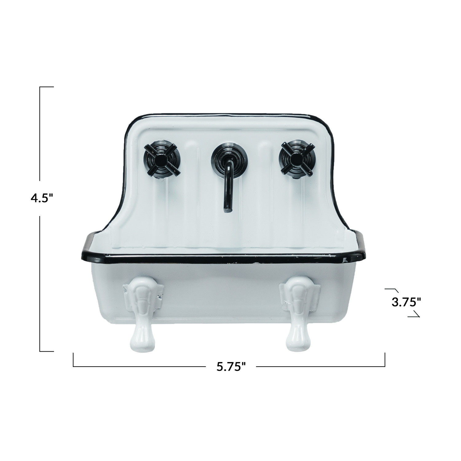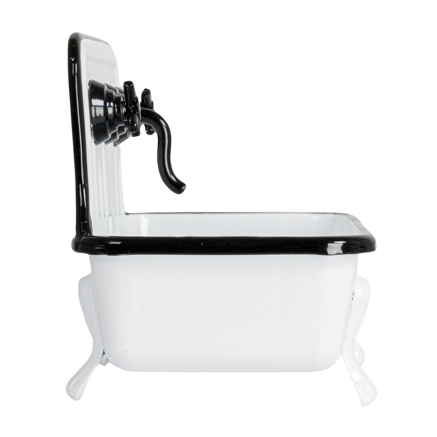 This Metal Soap Dish, with its charming sink and faucet design, offers a playful nod to classic bathroom fixtures. The contrasting white and black finish provides a neutral palette that complements any color scheme, while the dimensions ensure it fits neatly on most surfaces. Whether the bathroom style is industrial, farmhouse, or rustic, this soap dish serves as a whimsical yet practical accessory that's sure to delight. Its sturdy construction means it's built to last, just like the timeless design it emulates.