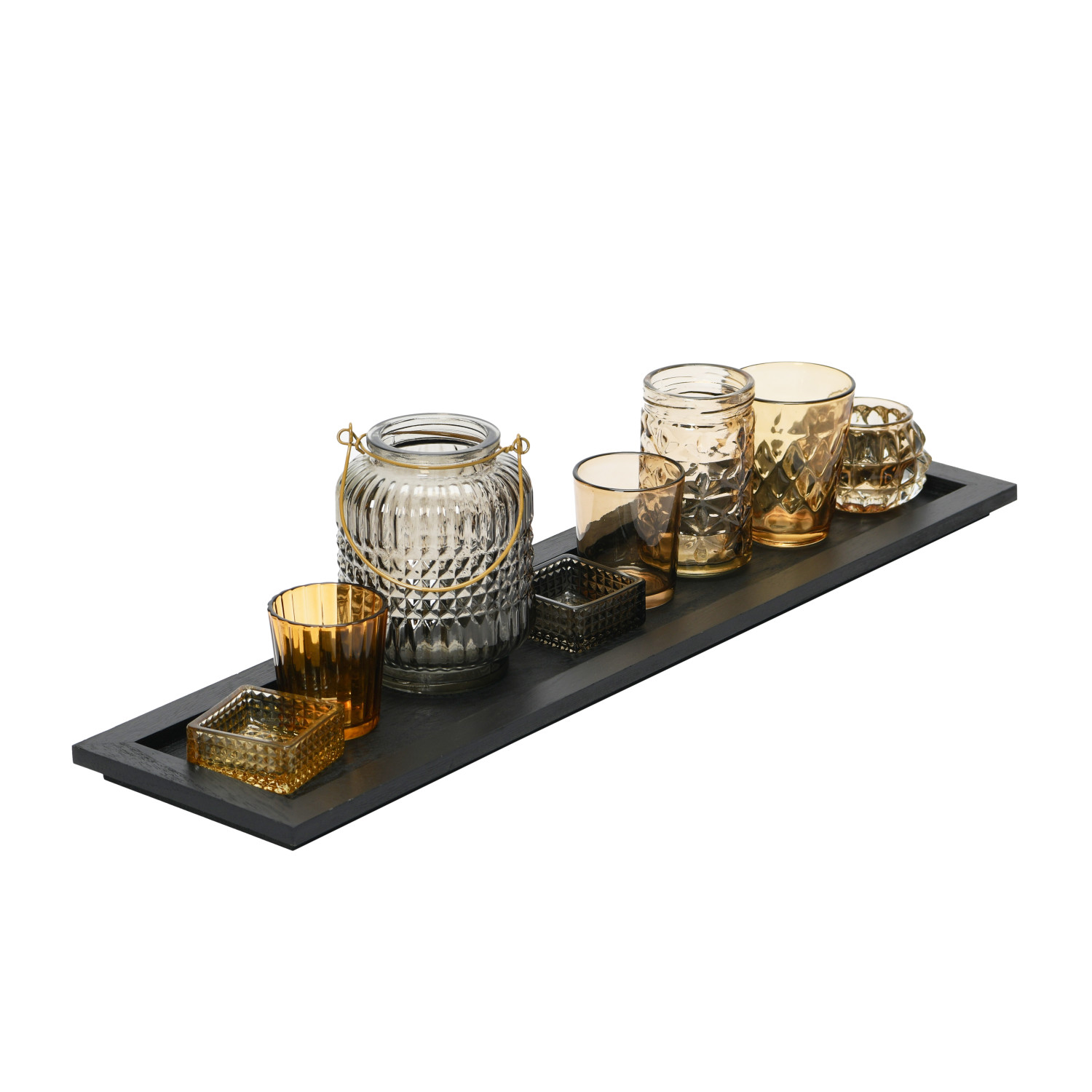 Catalog Name: 22"L x 5-1/2"W x 4-1/4"H Wood Tray w/ Pressed Glass Tealight/Votive Holders, Multi Color, Boxed Set of 9