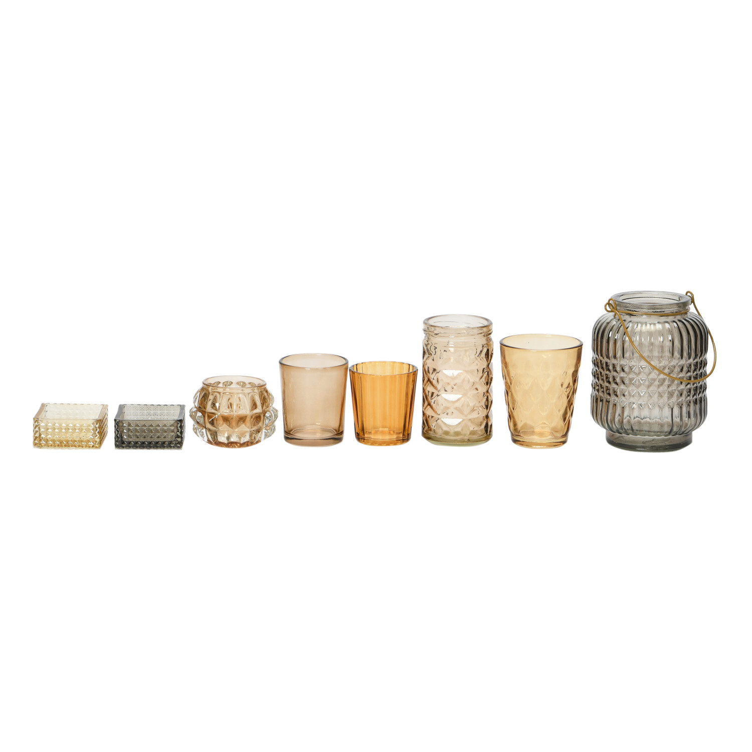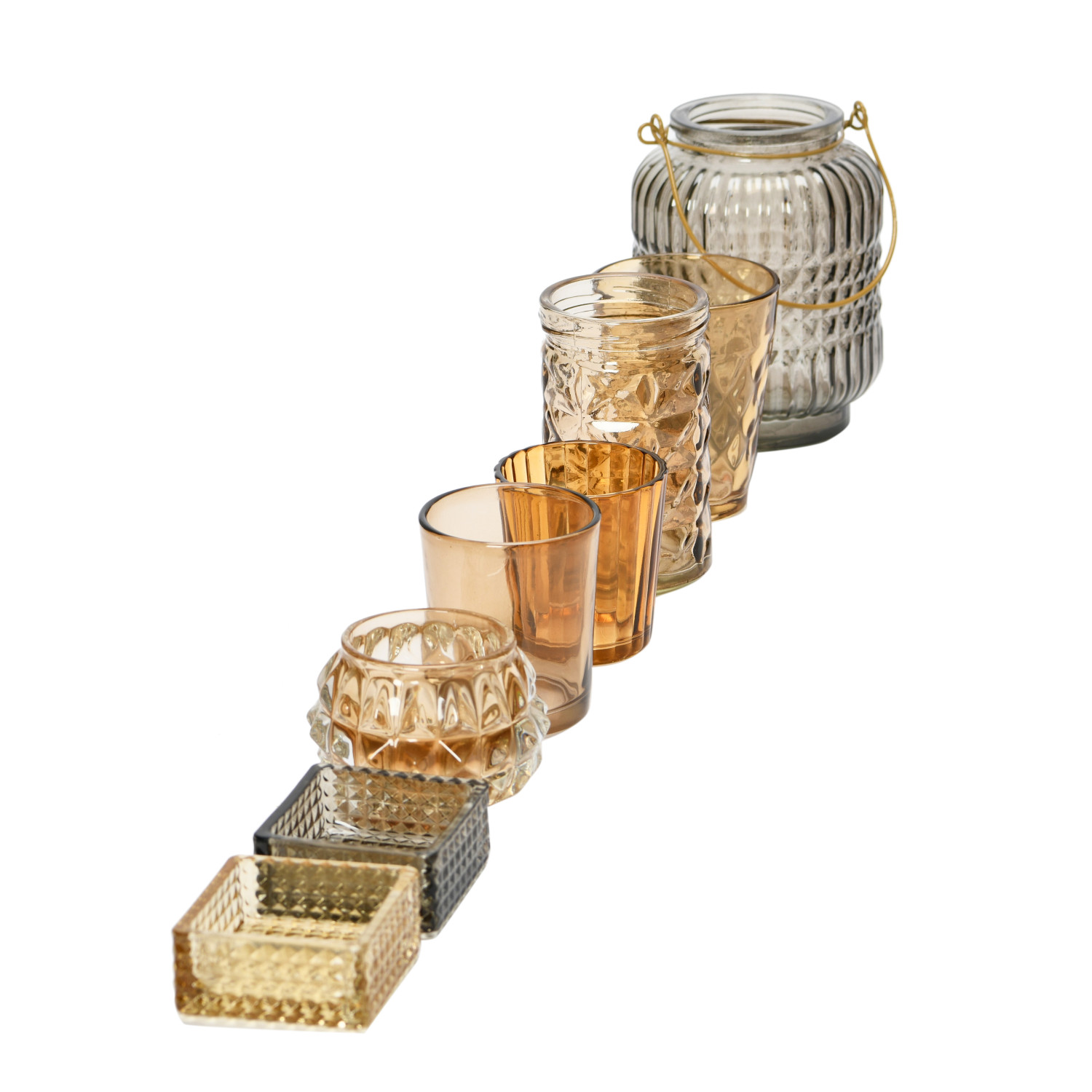 A stunning set of 8 glass votive holders with embossed patterns and transparent colors, arranged on a sleek black wood tray. A perfect accessory for any home decor style, from bohemian and eclectic to modern and elegant. Display it on the mantel, coffee table, console table, or shelf. Made of high-quality glass with embossed designs and wood with a black finish.