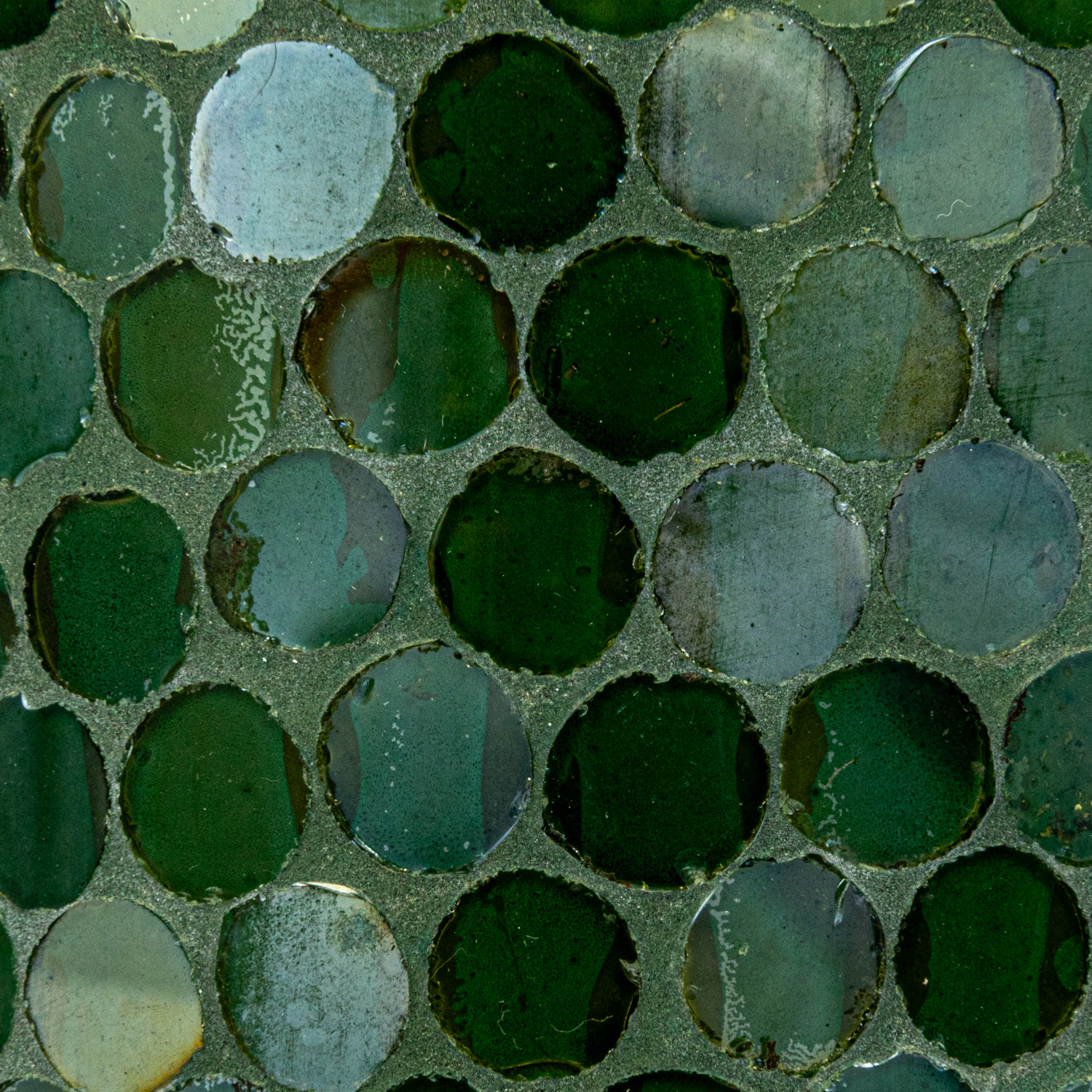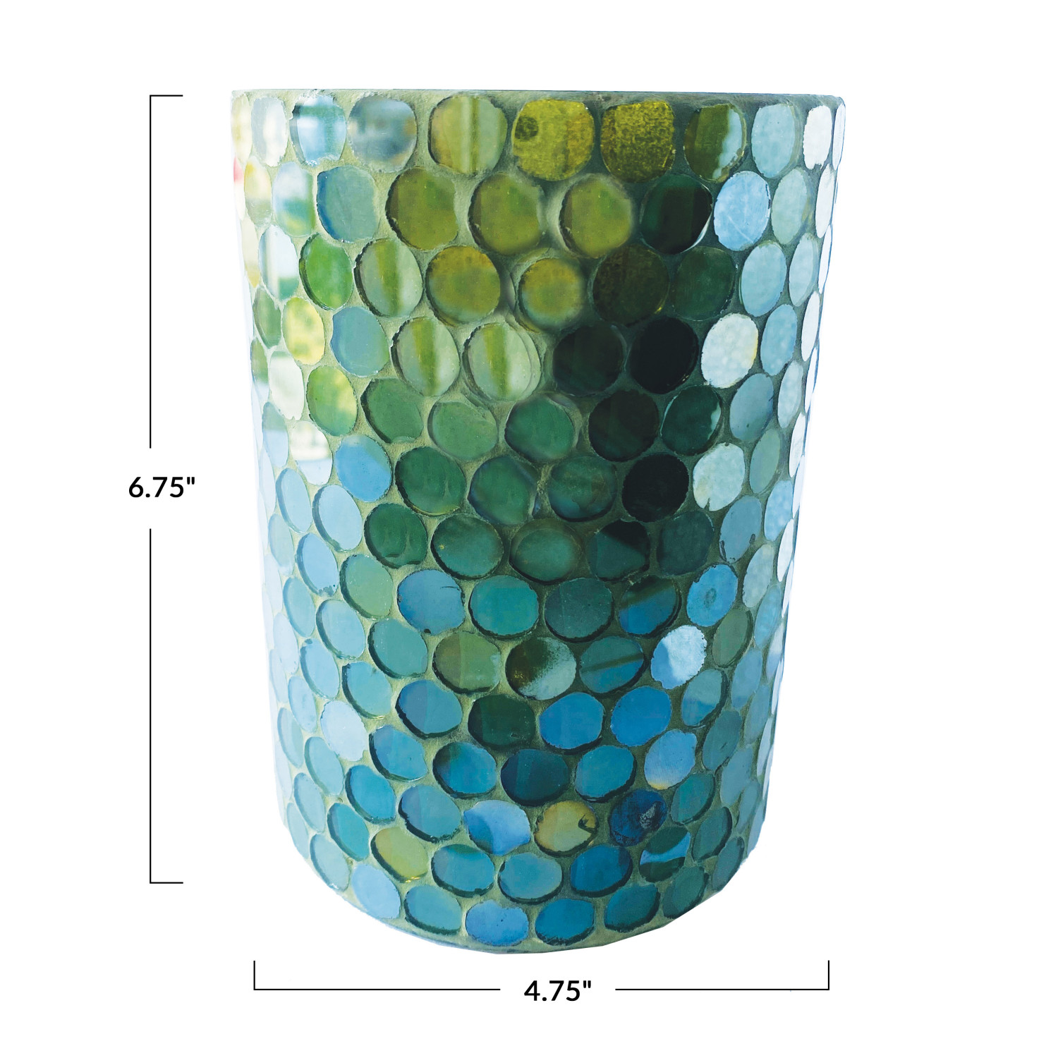 Catalog Name: 4-3/4" Round x 6-3/4"H Recycled Glass Mosaic Votive Holder, Iridescent Green