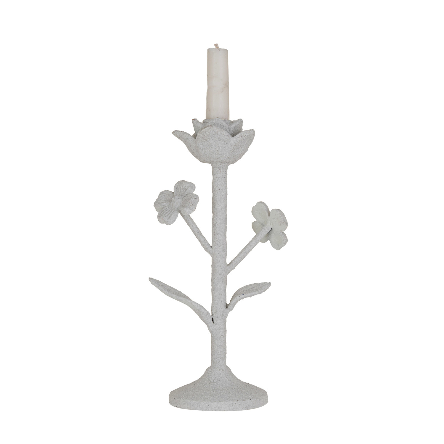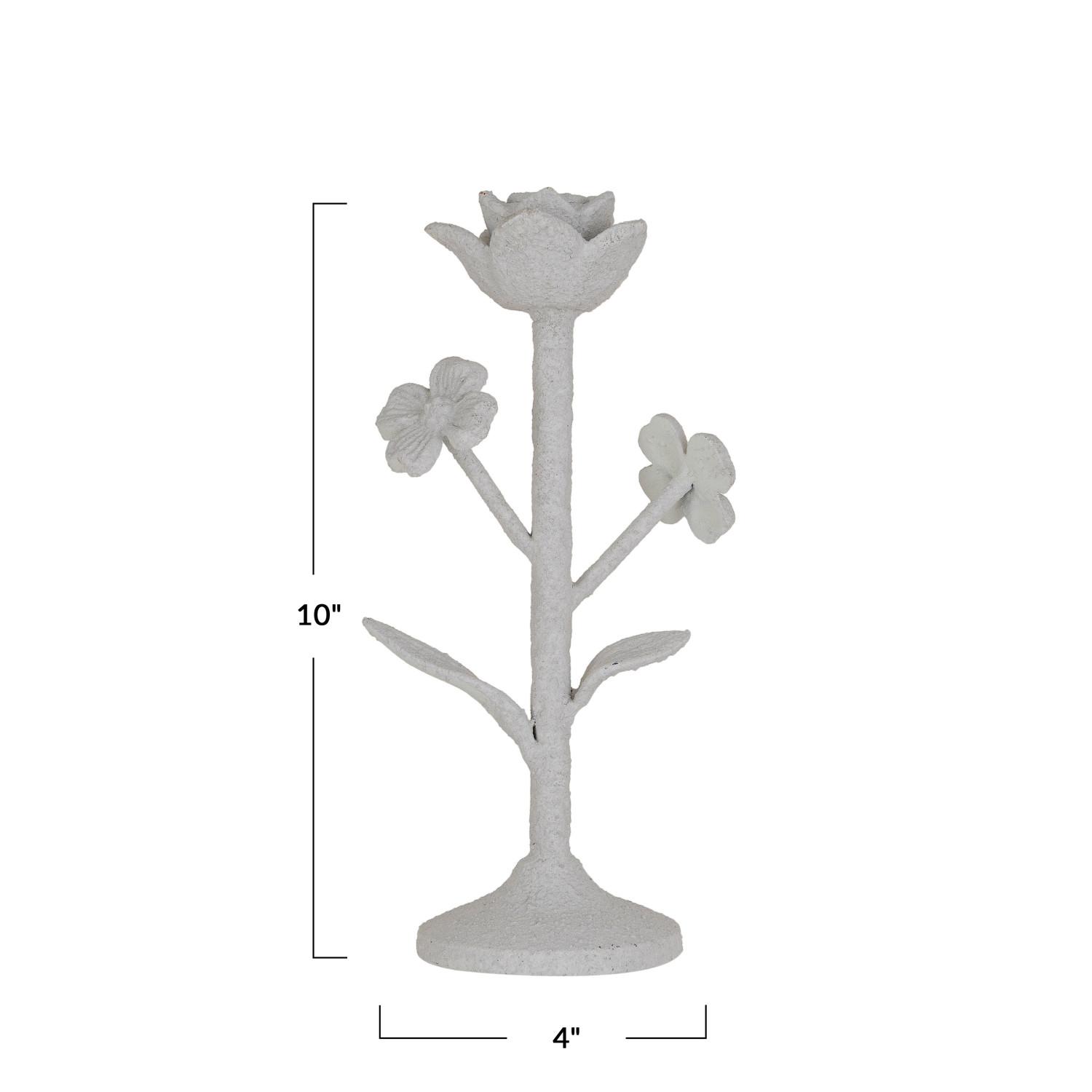 Catalog Name: 4"L x 3-3/4"W x 10"H Coarse Cast Iron Flower Taper Holder w/ Flowers, Volcano Finish, White