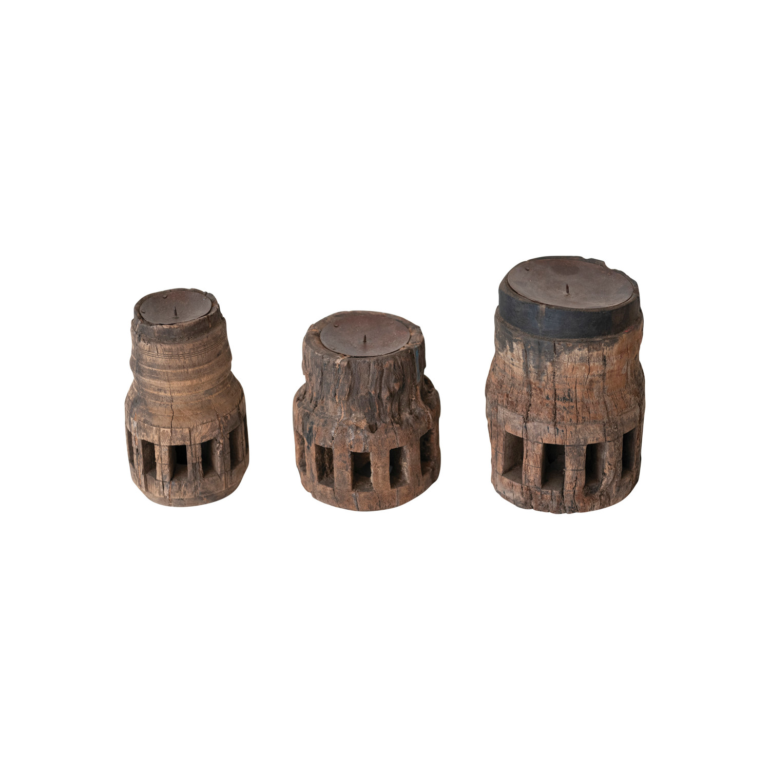 Catalog Name: Approximately 4-1/2" Round x 6"H Found Carved Wood Candle Holder, Heavily Distressed Finish (Holds 3" Pillar) (Each One Will Vary)
