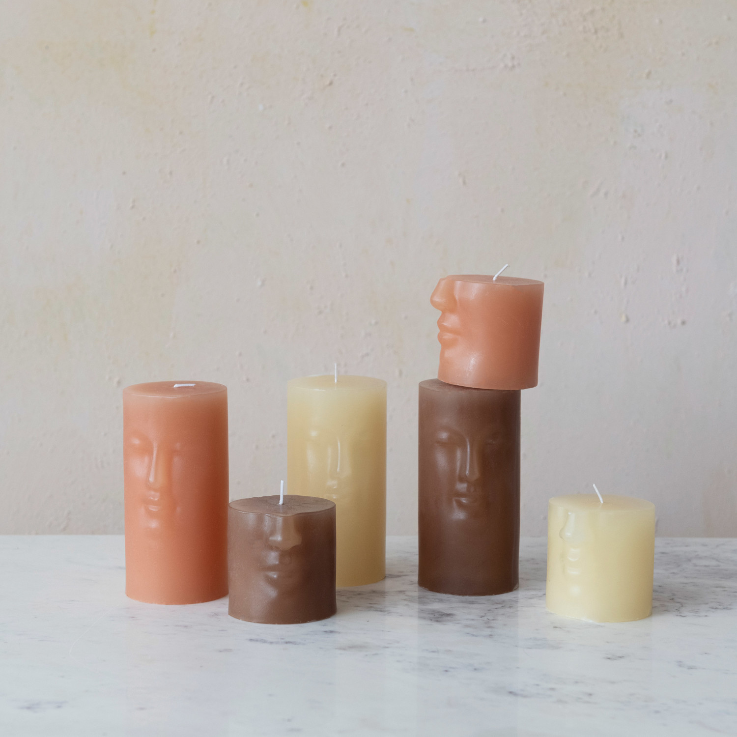 This intricately carved pillar candle showcases the striking silhouette of a face. Mix and match the hues and sculptural silhouettes of our artfully crafted totems and tapers for a refined candlelight arrangement on a dining table or mantelpiece.