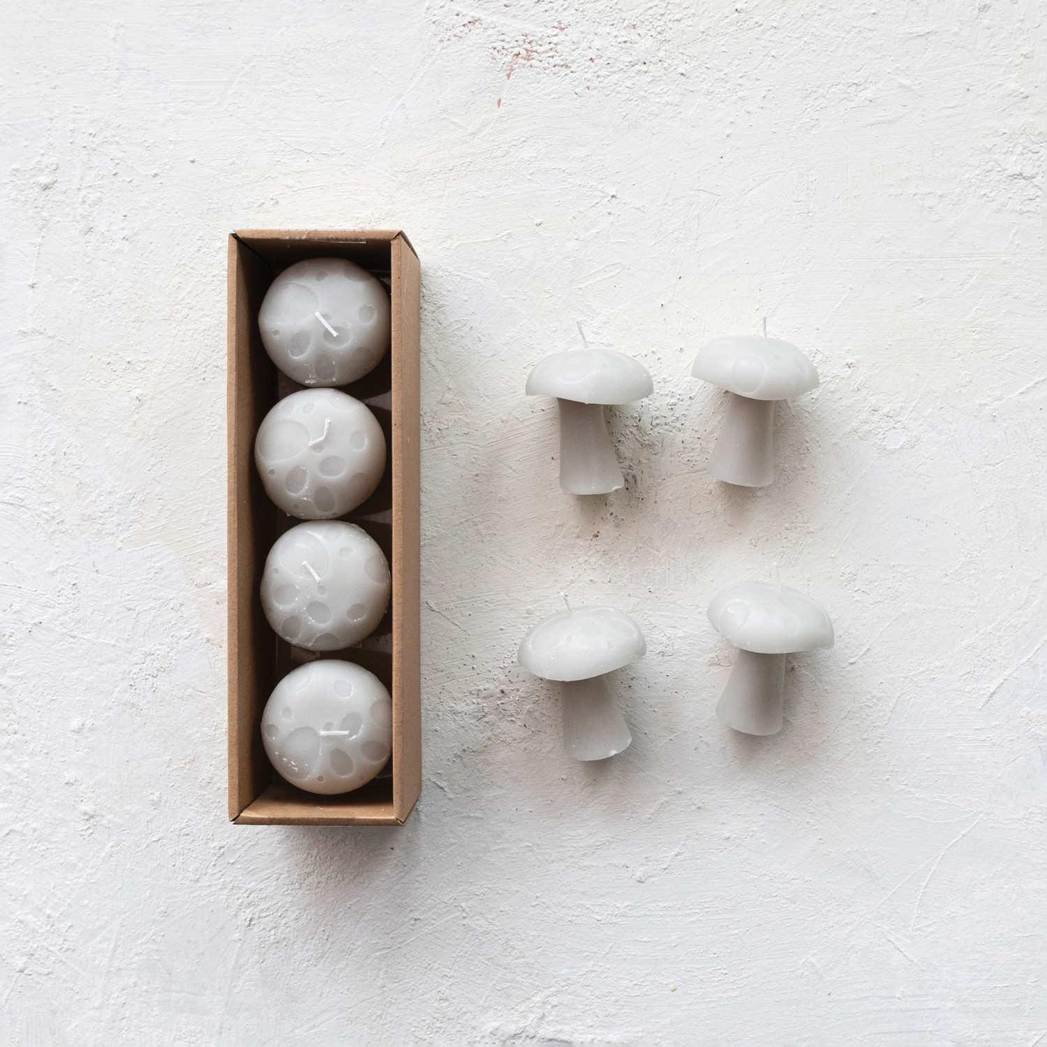 Catalog Name: 2-1/2" Round x 3"H Unscented Mushroom Shaped Candles in Box, Grey, Set of 4 (Approximate Burn Time 2 Hours)