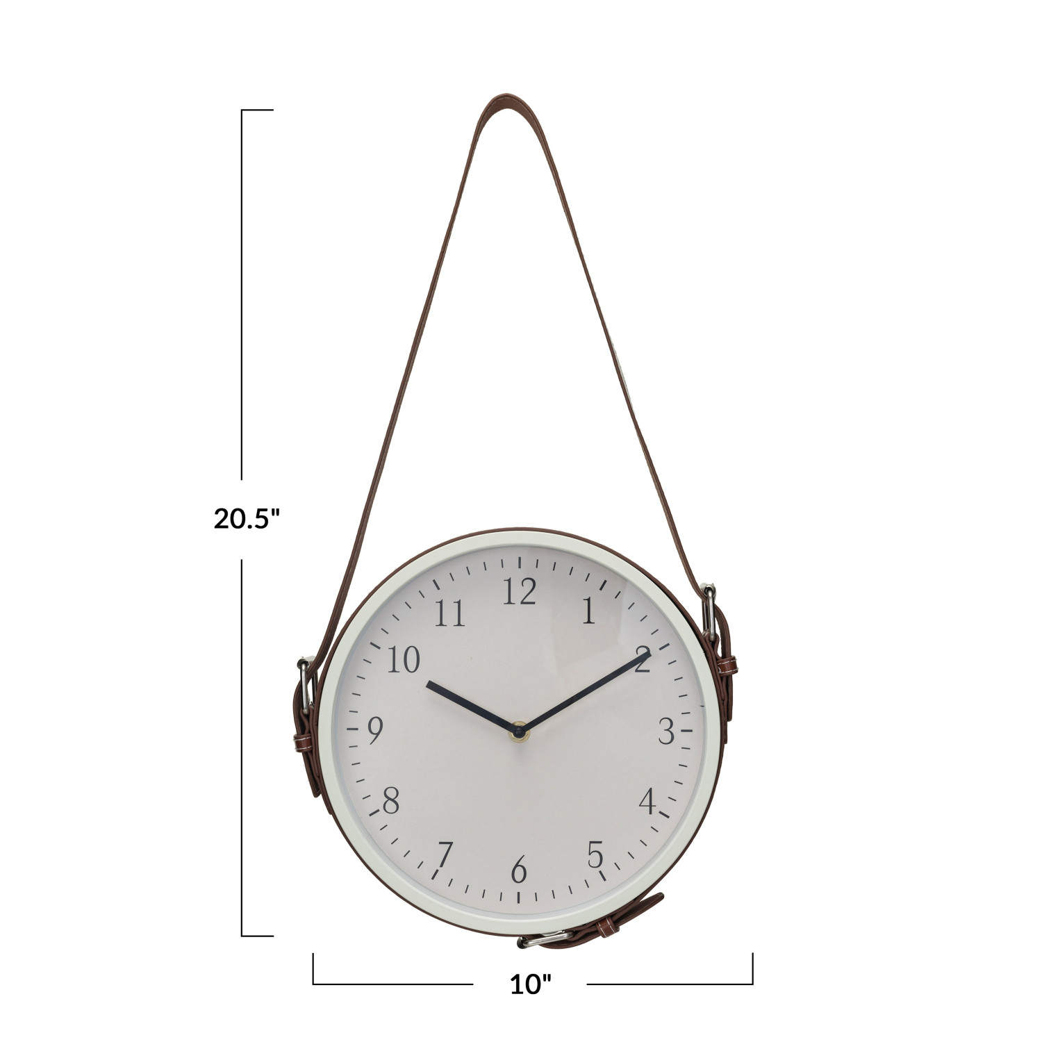 Catalog Name: 10" Round x 20-1/2"H Hanging Plastic Wall Clock w/ Adjustable Leather Strap, White & Brown (Requires 1-AA Battery)