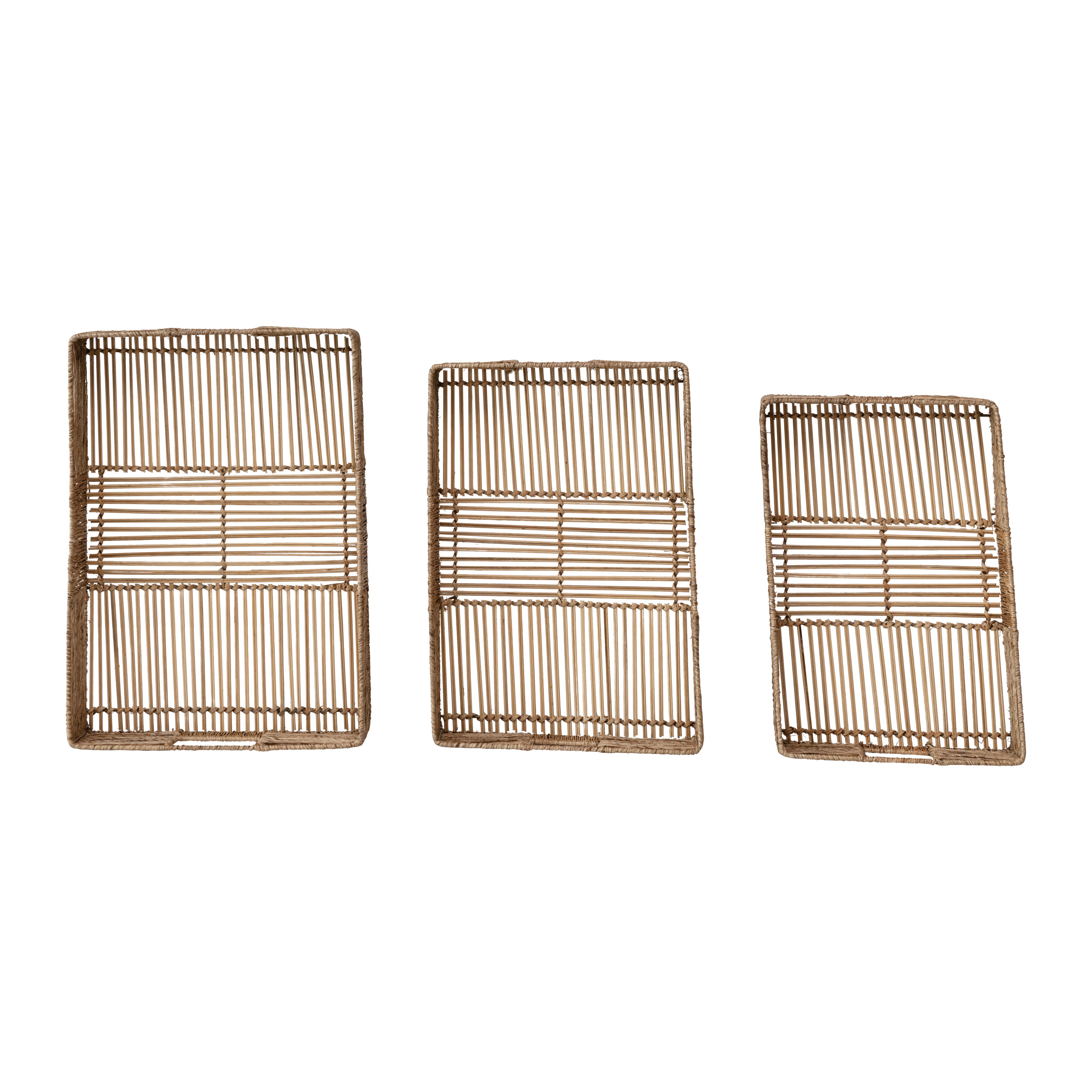Catalog Name: 18"L x 13-1/2"W, 16-1/2"L x 12"W & 15"L x 10"W Decorative Hand-Woven Bamboo & Jute Trays w/ Handles, Natural, Set of 3