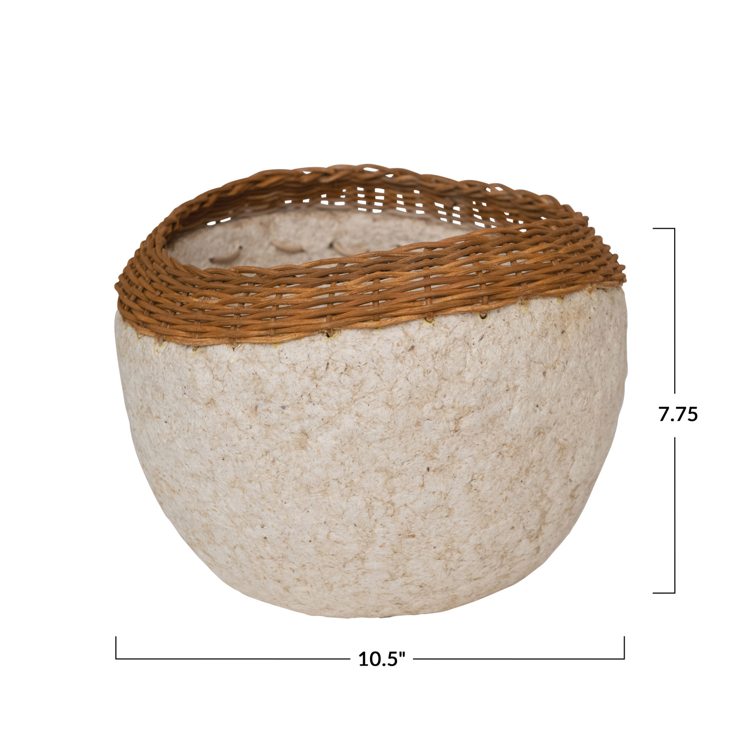 Catalog Name: Approximately 10-1/2" Round x 7-3/4"H Decorative Handmade Paper Mache Bowl w/ Hand-Woven Wicker Rim, White & Natural (Each One Will Vary)