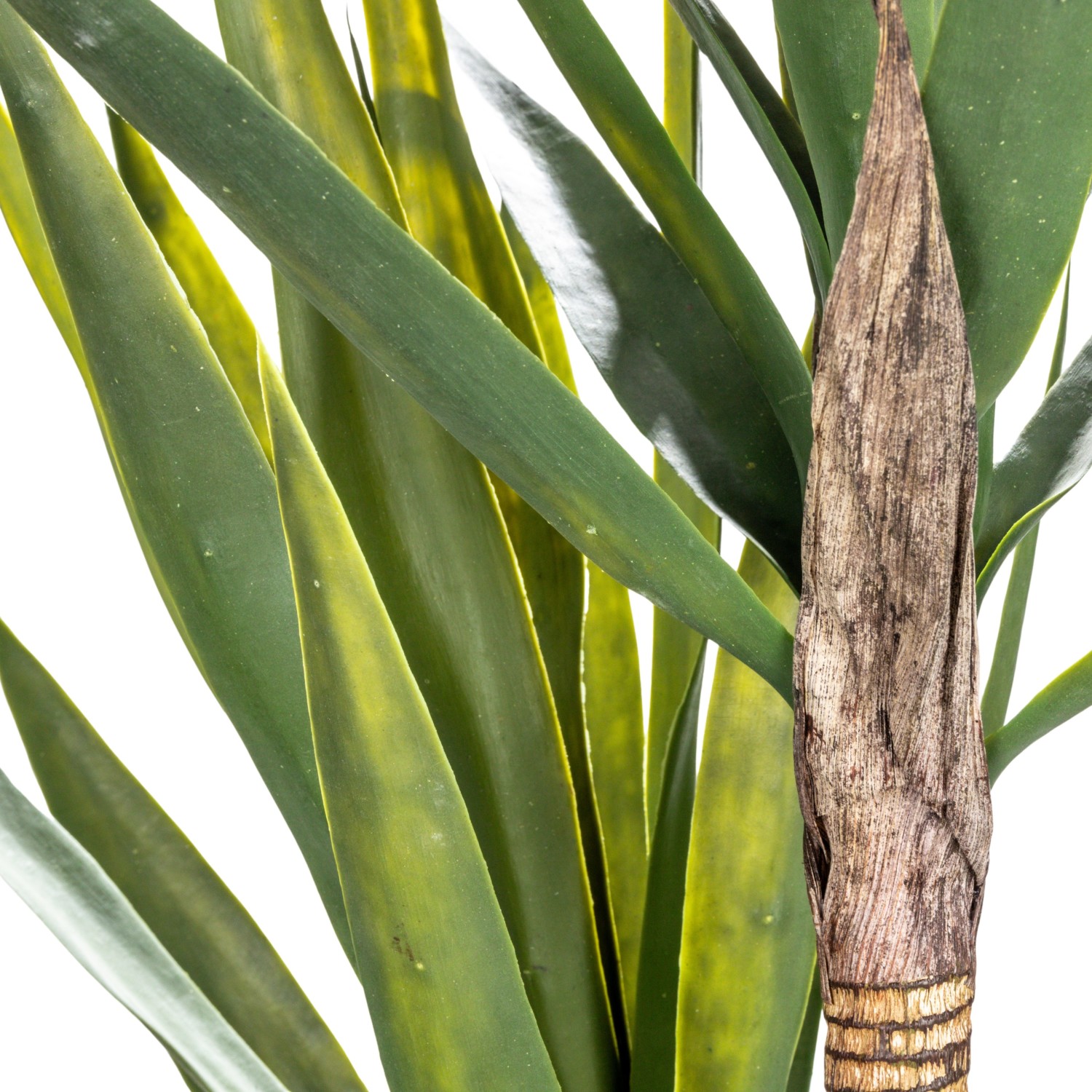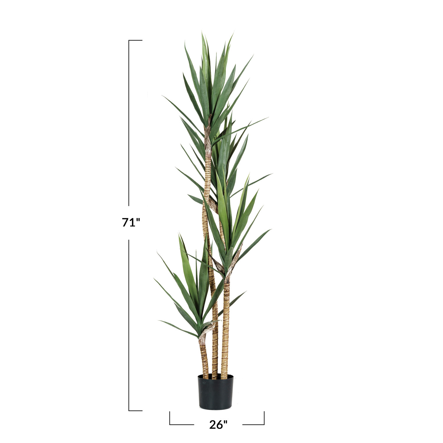 Add greenery and freshness to any space with this faux yucca tree in a plastic pot. This stunning accessory features a realistic and low-maintenance faux botanical that has a green yucca tree with long and spiky leaves. The yucca tree is planted in a black plastic pot that is sturdy and simple and can be placed on the floor or on a stand. The plastic material is durable and lightweight and has a lifelike appearance and texture that mimics the real plant. The faux botanical only requires spot cleaning with a soft cloth and does not need any watering or pruning. It measures 26.25 inches round and 70.75 inches high, making it a statement piece for any space. This faux yucca tree in a plastic pot is a versatile accessory that can fit any farmhouse, botanical, garden, modern, or boho-style home. It can be used to add greenery and freshness to any space with its stunning design and quality material.