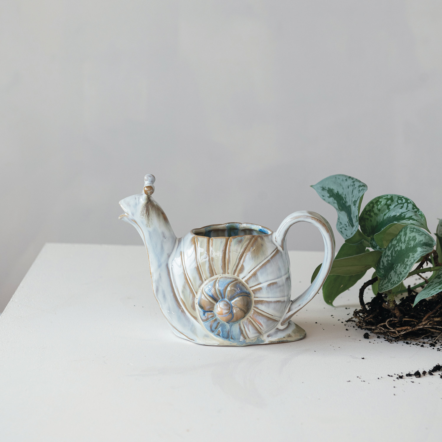 This Stoneware Snail Shaped Watering Can is not only a functional tool but also a delightful addition to the gardening essentials. Measures 8.75 inches in length and 6 inches in height, a comfortable size for daily use. With a capacity of 26 oz., it's ideal for watering small to medium-sized plants. The snail design brings a playful vibe to the task at hand, while the multi-colored finish adds a splash of color to every gardening routine. Whether a seasoned gardener or just starting out, this watering can is sure to make plant care more enjoyable. Its sturdy stoneware construction ensures it will be a long-lasting and cherished item in the garden or home.