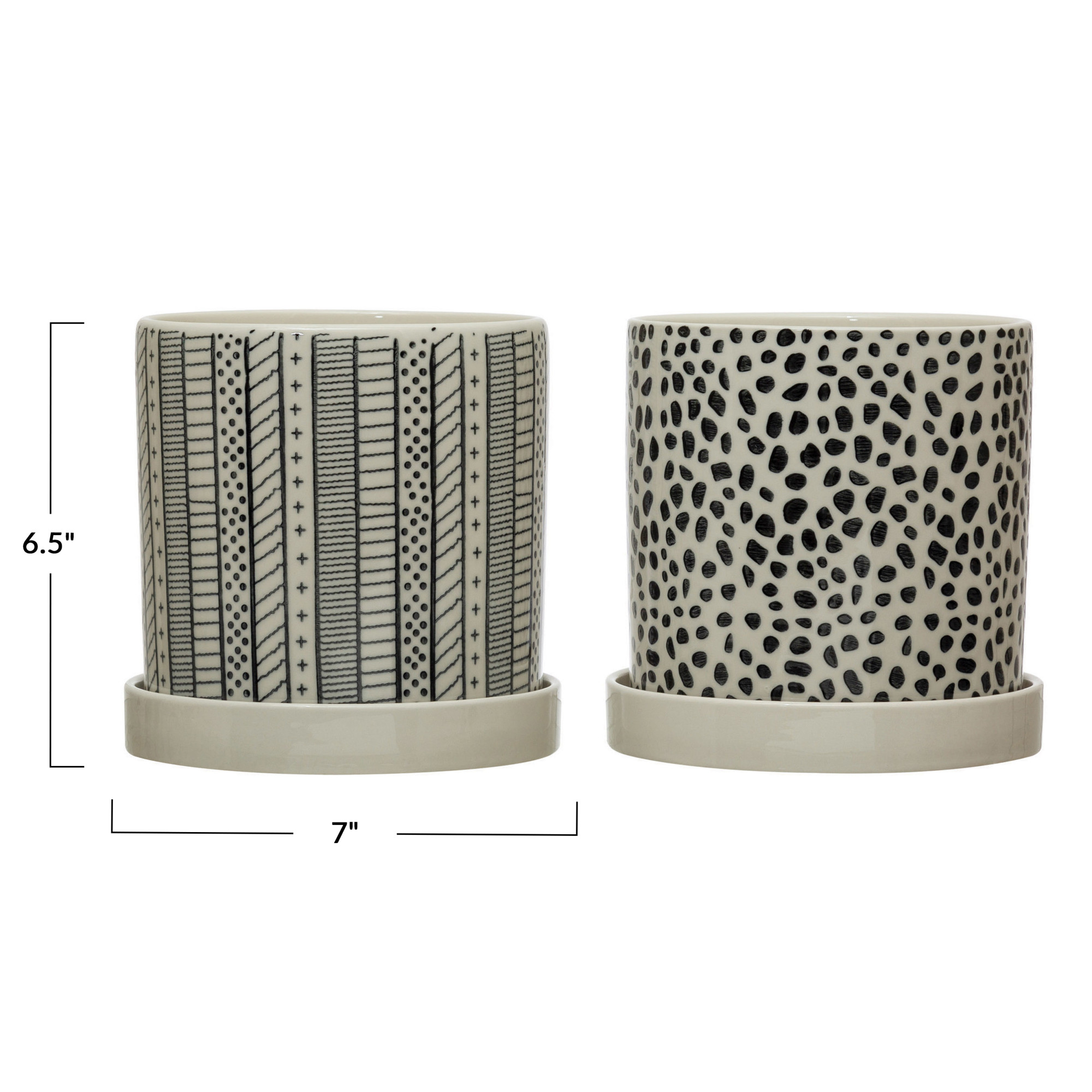 Catalog Name: 7" Round x 6-1/2"H Stoneware Planter w/ Saucer & Pattern, Black & White, Set of 2, 2 Styles (Holds 6" Pot)
