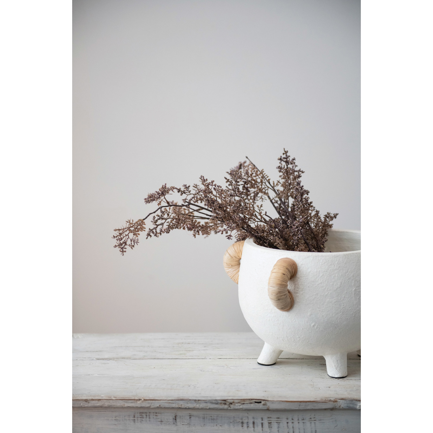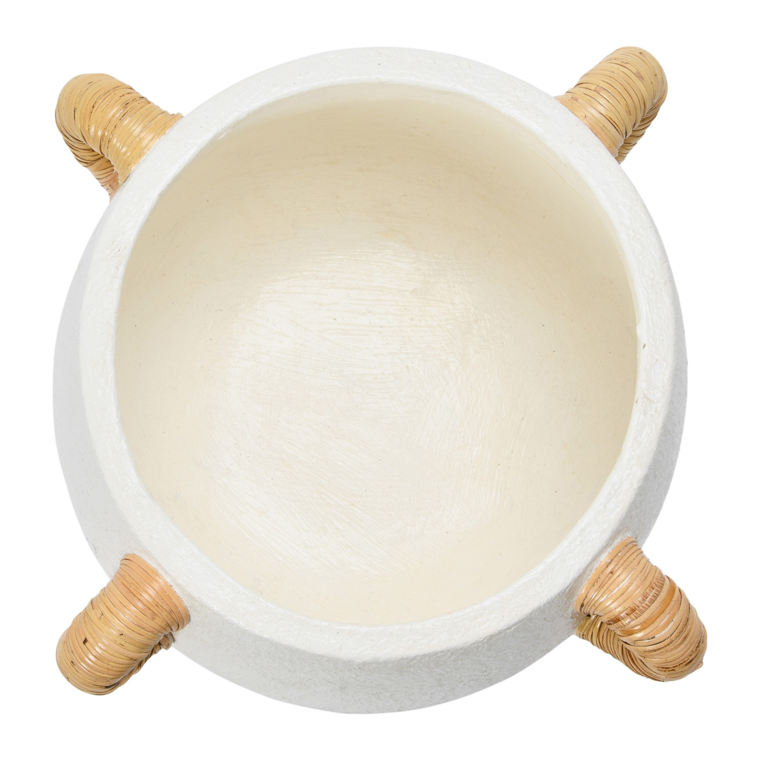 Add some charm and character to any indoor plants with this cream terra-cotta planter with rattan handles. This planter has a footed base that elevates plants and adds some dimension to the space. It also has four rattan-wrapped decorative handles that enhance the rustic and natural look of the planter. The planter does not have a drainage hole, so use it indoors without worrying about water leakage. Add a layer of pebbles or gravel at the bottom of the planter to improve drainage and prevent root rot. The planter can hold a 12-inch pot or smaller, making it suitable for various types of plants, such as succulents, herbs, flowers, or ferns. The planter has a cream color that complements any color scheme and style. It is ideal for country, farmhouse, or cottage-style home decor, as it creates a cozy and inviting atmosphere with its natural materials and colors. Whether placed on a windowsill, shelf, table, or floor, this planter will make the plants look more beautiful and livelier.