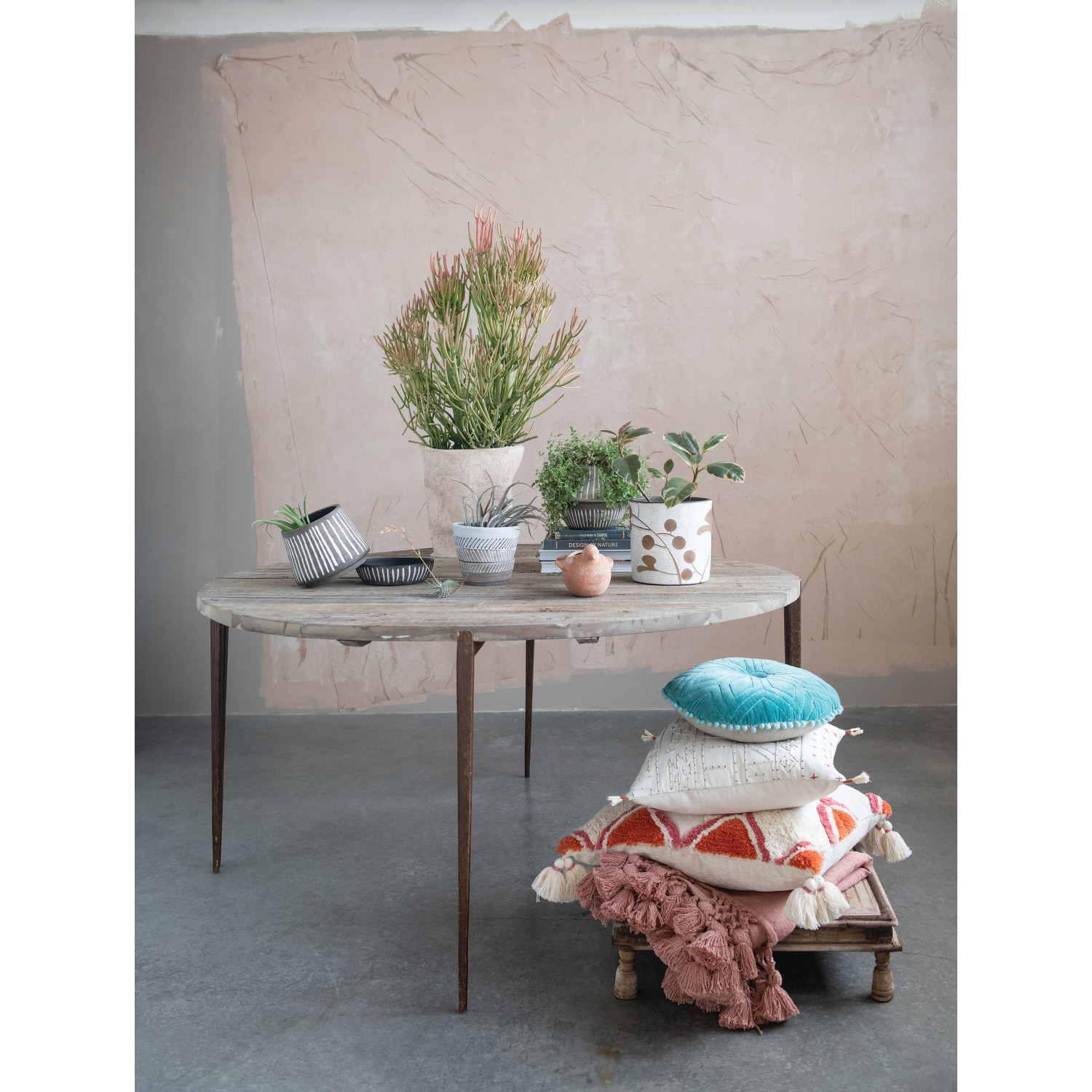 This pot is a beautiful way to display faux or real florals. Made out of stoneware, this pot has rattan stitching and a calming cream colored base. This small planter looks great on table tops and shelves, and displays any florals or stems in a beautiful way. Holds 5" Pot.