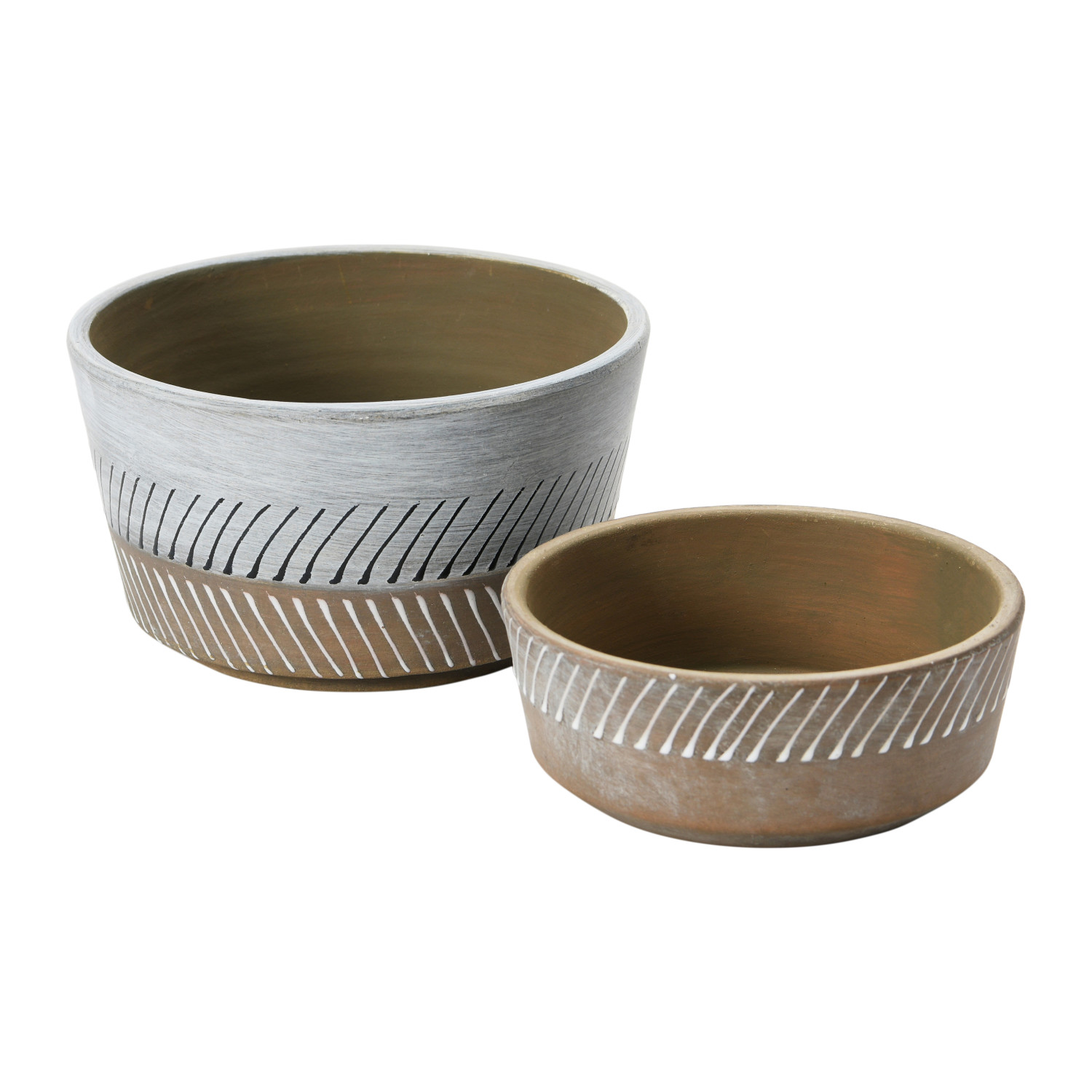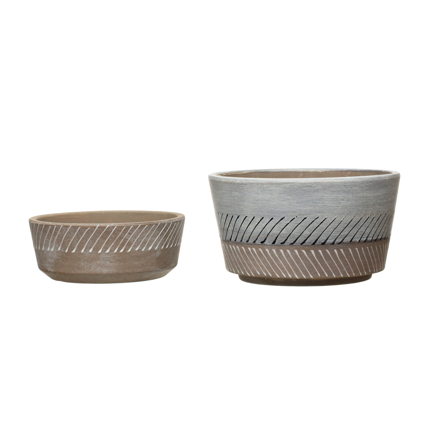 Catalog Name: 6-3/4" Round x 5-1/2"H Hand-Painted Terra-cotta Planter w/ Saucer & Pattern, White & Black, Set of 2 (Holds 5" Pot)