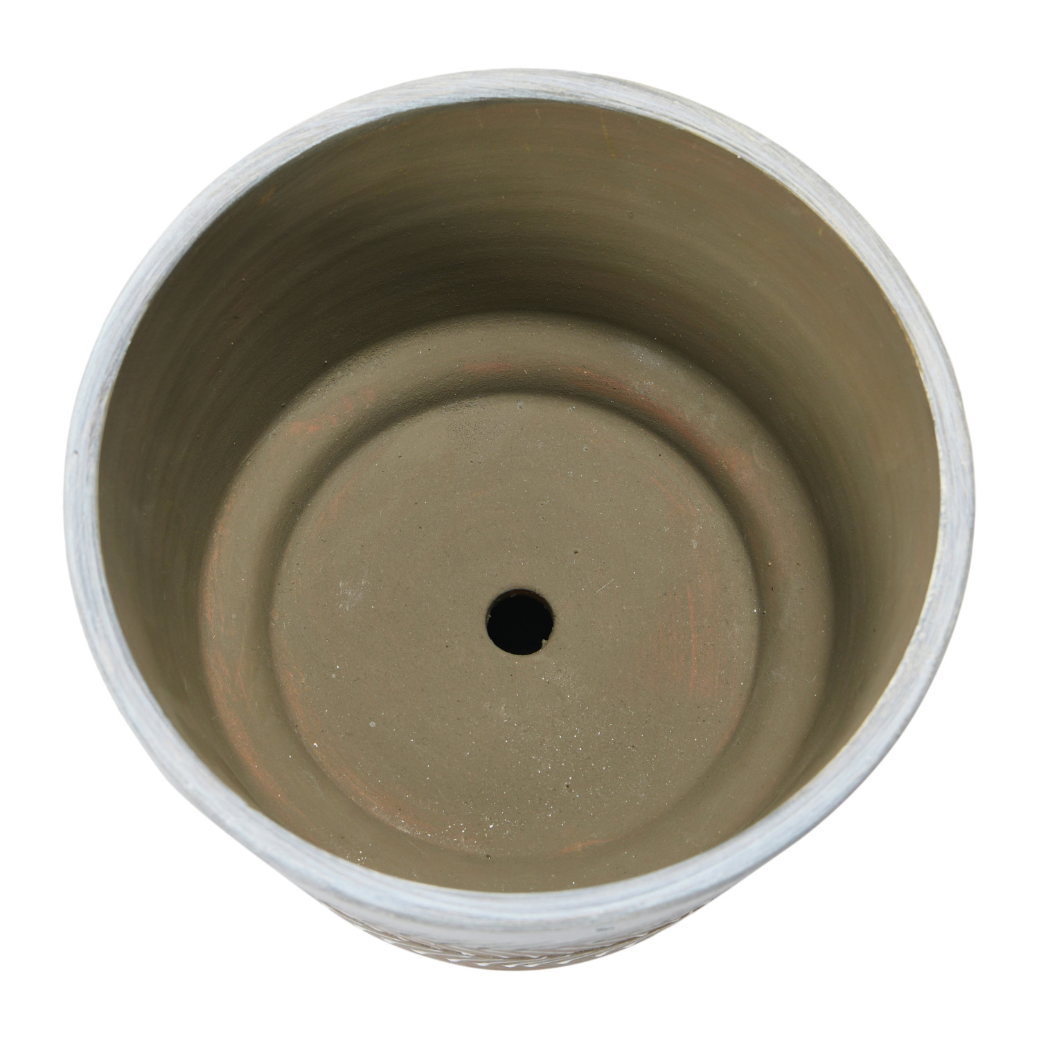Display plants in a stunning and elegant way with this hand-painted terra-cotta planter with saucer and pattern. This planter is made of high-quality terra-cotta that is porous and breathable. This gives it a natural and earthy appearance that complements any plant. It also has a saucer that catches excess water and prevents spills. It also has drainage holes at the bottom that keeps plants healthy and happy. This planter has a white and grey color scheme that creates a striking contrast and a geometric pattern that adds style and flair to the space. This planter is suitable for any style of home decor, from contemporary to classic, as it has a simple and sleek design that matches any palette. Use it for indoor or outdoor plants, such as succulents, herbs, or flowers. Place it on the windowsill, shelf, table, or porch to create a beautiful and inviting atmosphere in the home. The vase measures 6.75 inches in diameter, and 5.5 inches tall and can hold a 5-inch pot. This hand-painted terra-cotta planter with saucer and pattern is a stunning and elegant way to display plants in the home.