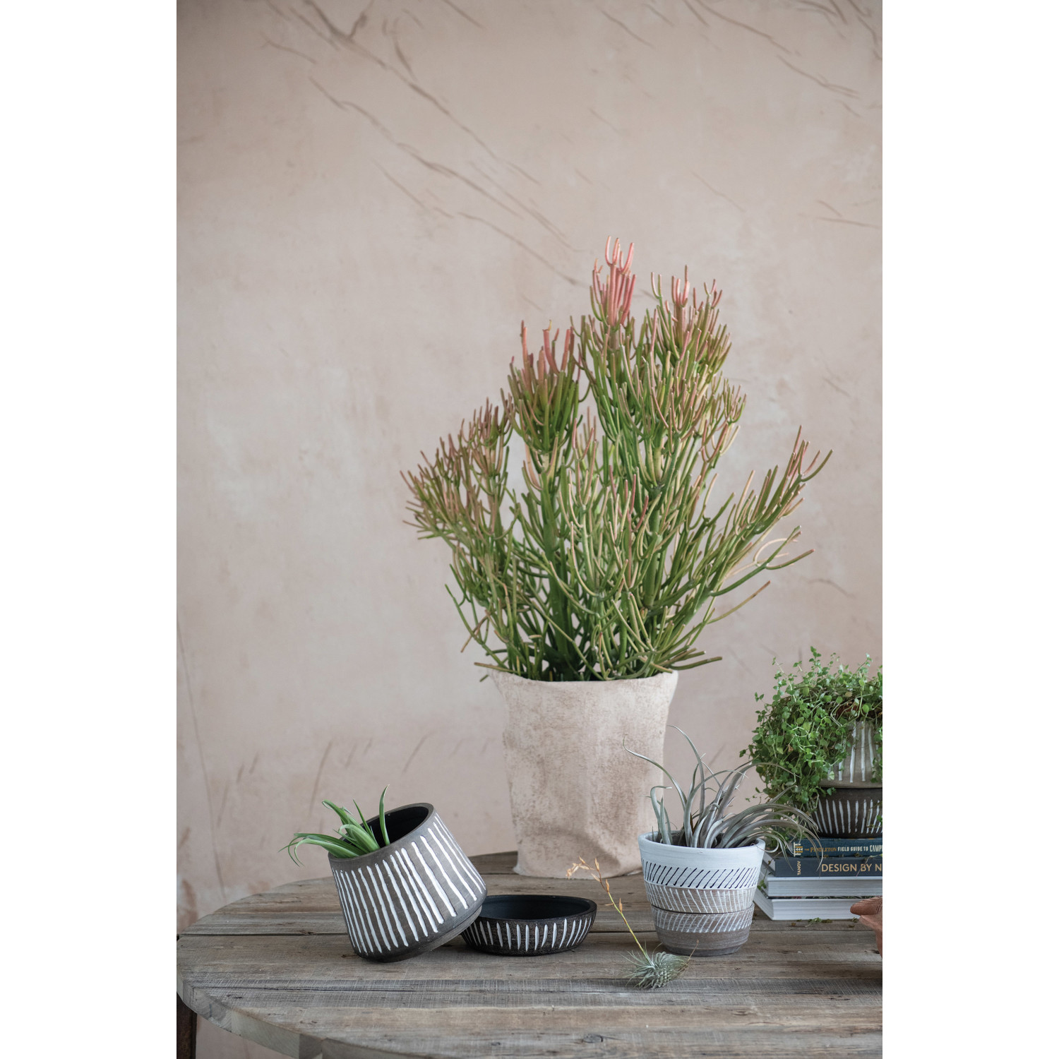This pot is an easy and stylish way to display faux or real florals. Made out of terracotta, this pot comes with a saucer and features a brown and white pattern. This looks great on table tops and shelves, and displays any plants in a unique setting. Holds 5" Pot.