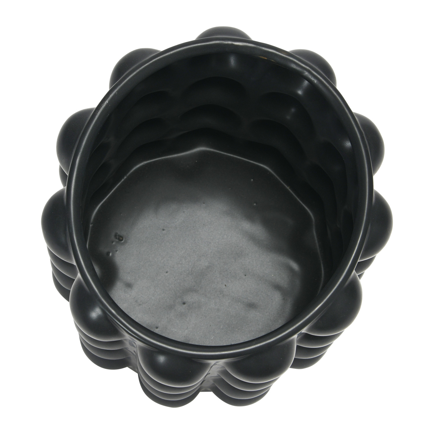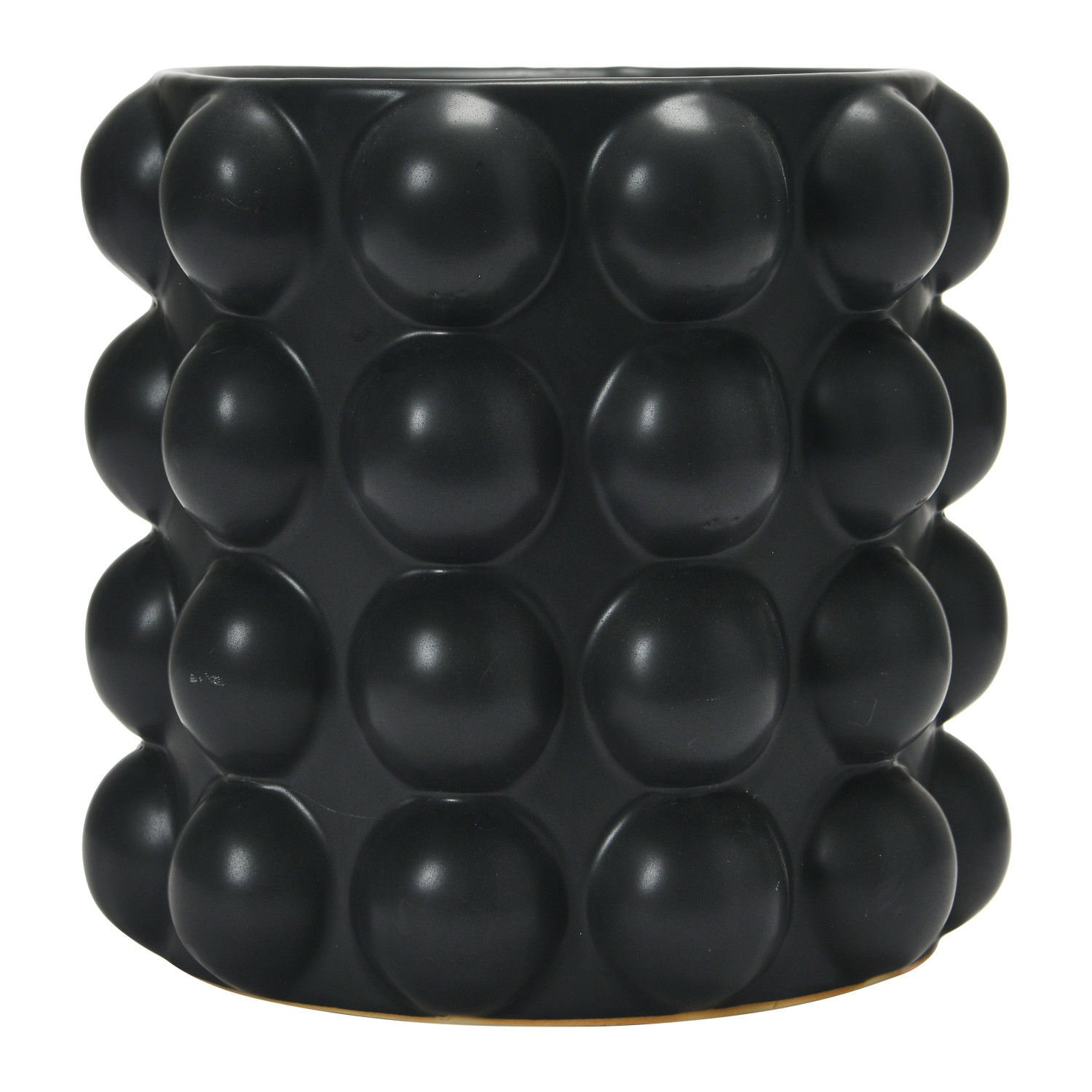A stunning stoneware planter that features a matte black finish and a textured surface with raised dots. This planter is perfect for adding a touch of modern elegance and sophistication to any space. It can hold an 8-inch pot, or plant it directly into it with some pebbles at the bottom for drainage. Made of stoneware.
