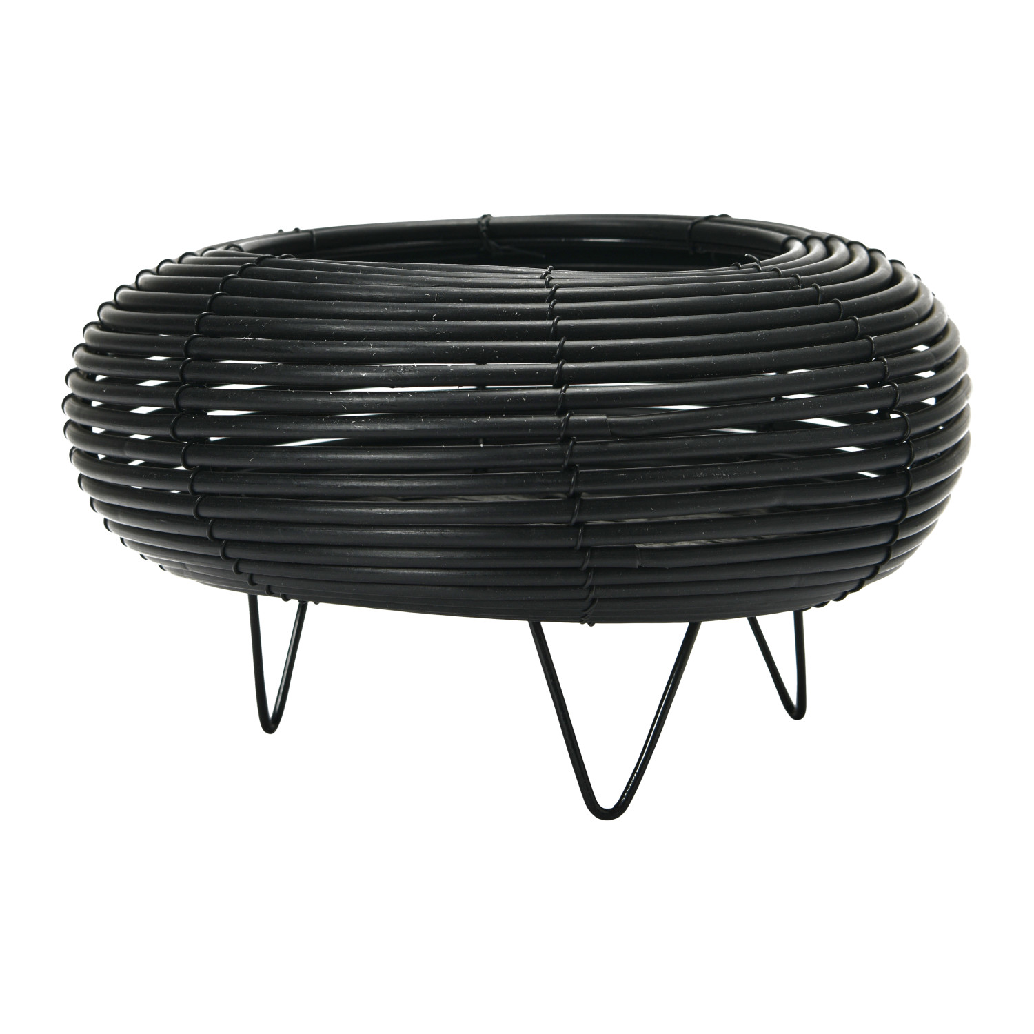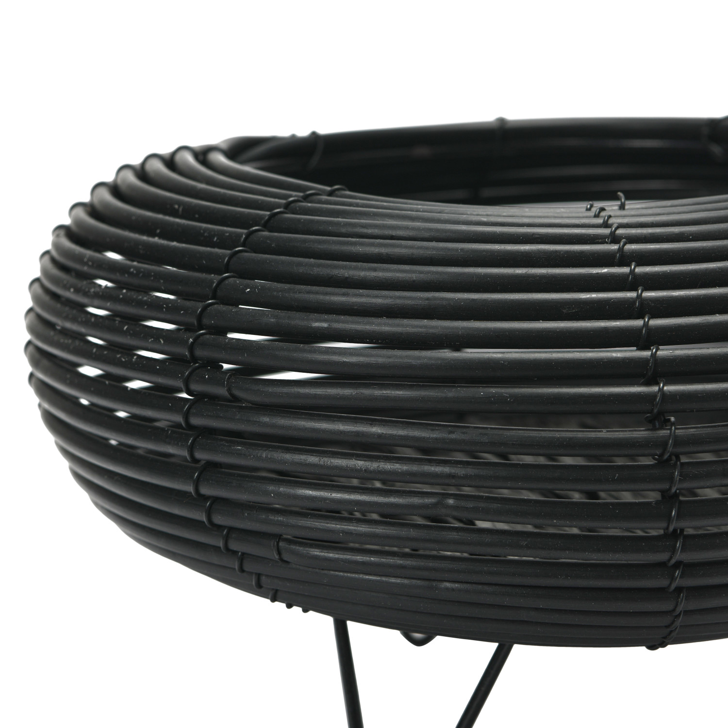 This planter is a sleek and modern piece of decor that features a black plastic body with a rolled design and three metal feet that add some shine and stability. This planter is suitable for any style of home decor, especially for contemporary, industrial, or minimalist look. The planter does not have any drainage holes, so it is best suited for plants that do not require a lot of water or for artificial plants. Made of plastic and metal.