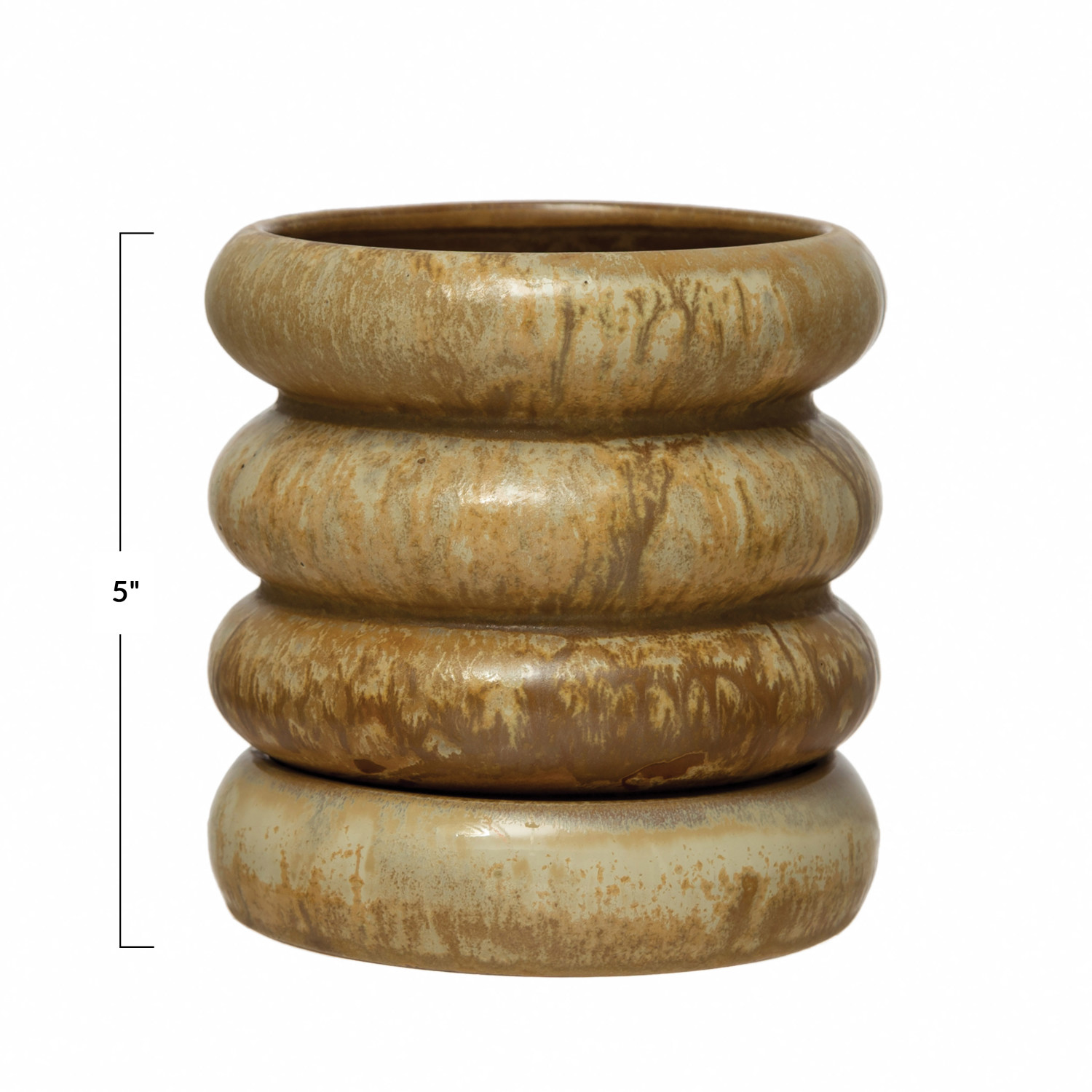 Catalog Name: 5" Round x 5"H Stoneware Planter w/ Saucer, Reactive Glaze, Butterscotch Color, Set of 2 (Holds 4" Pot) (Each One Will Vary)