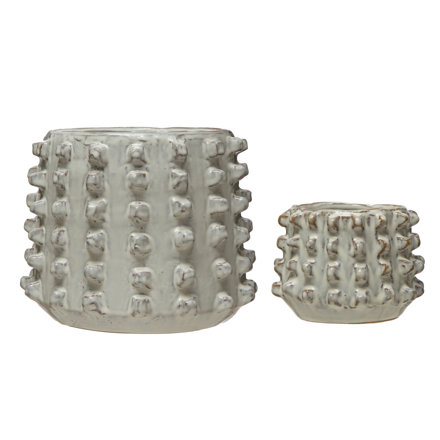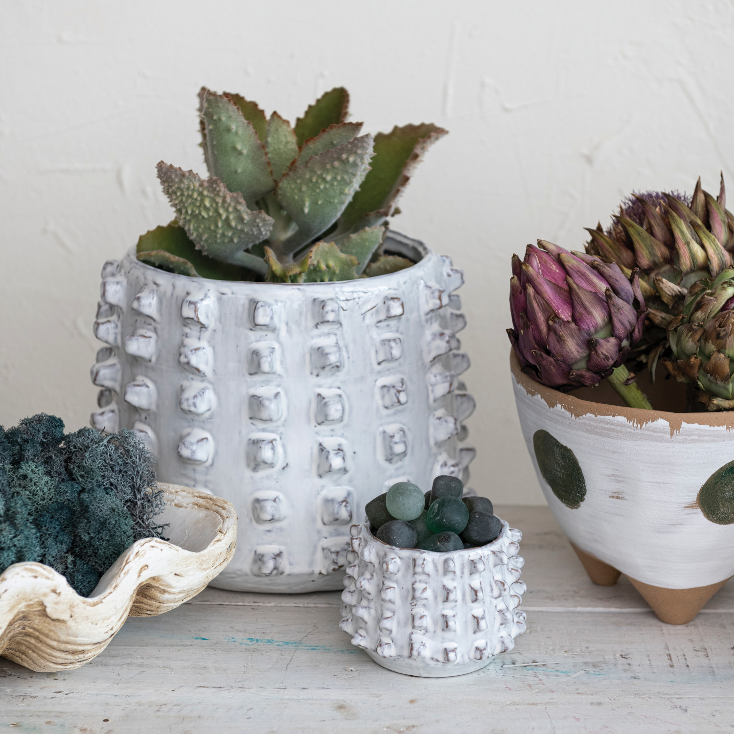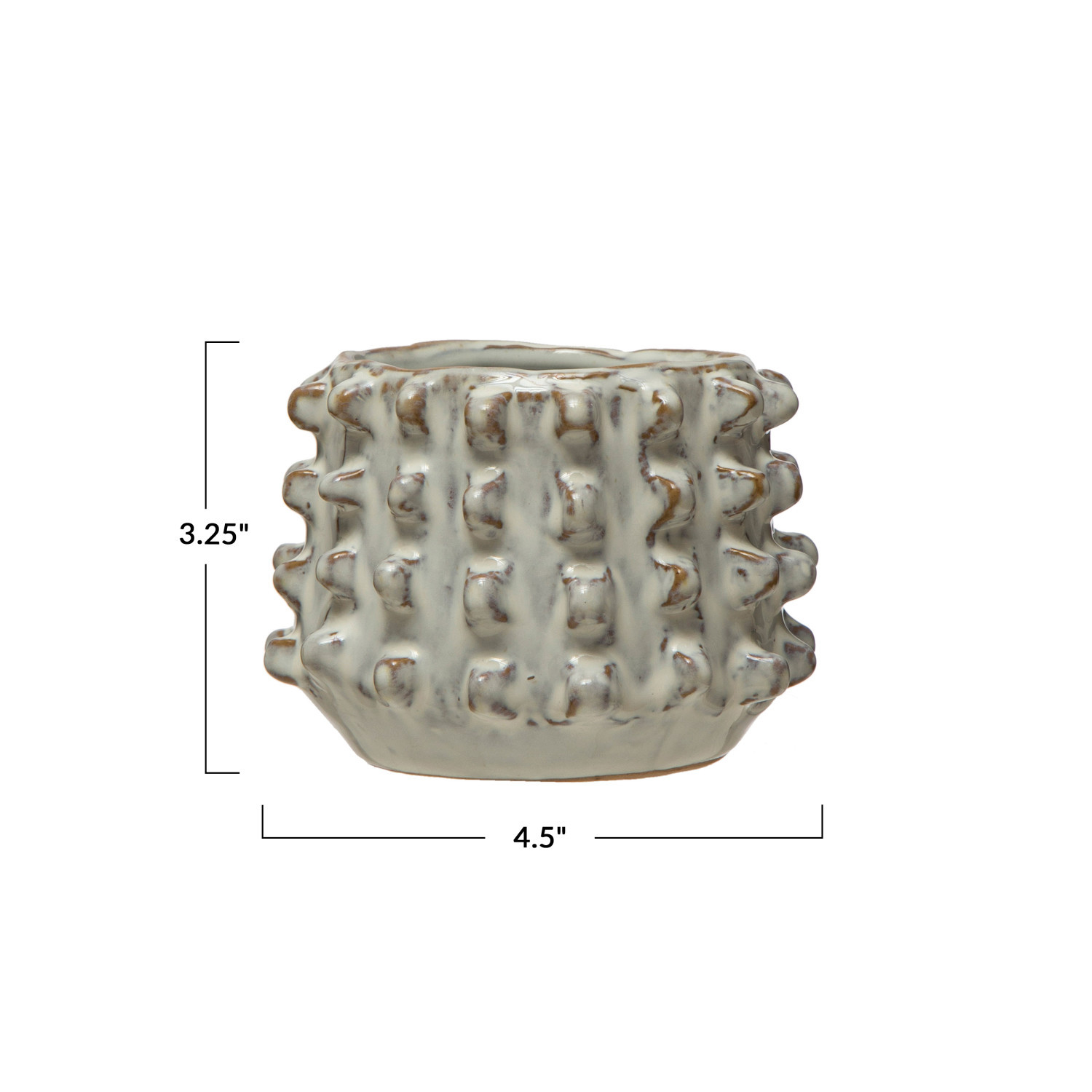 Catalog Name: 4-1/2" Round x 3-1/4"H Stoneware Sculptural Planter, Reactive Glaze, White (Holds 4" Pot) (Each One Will Vary)