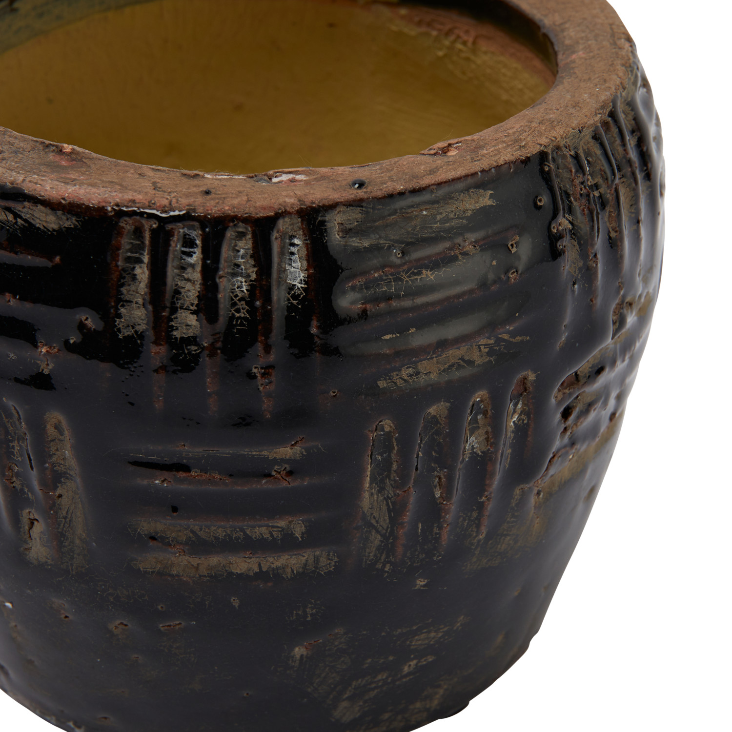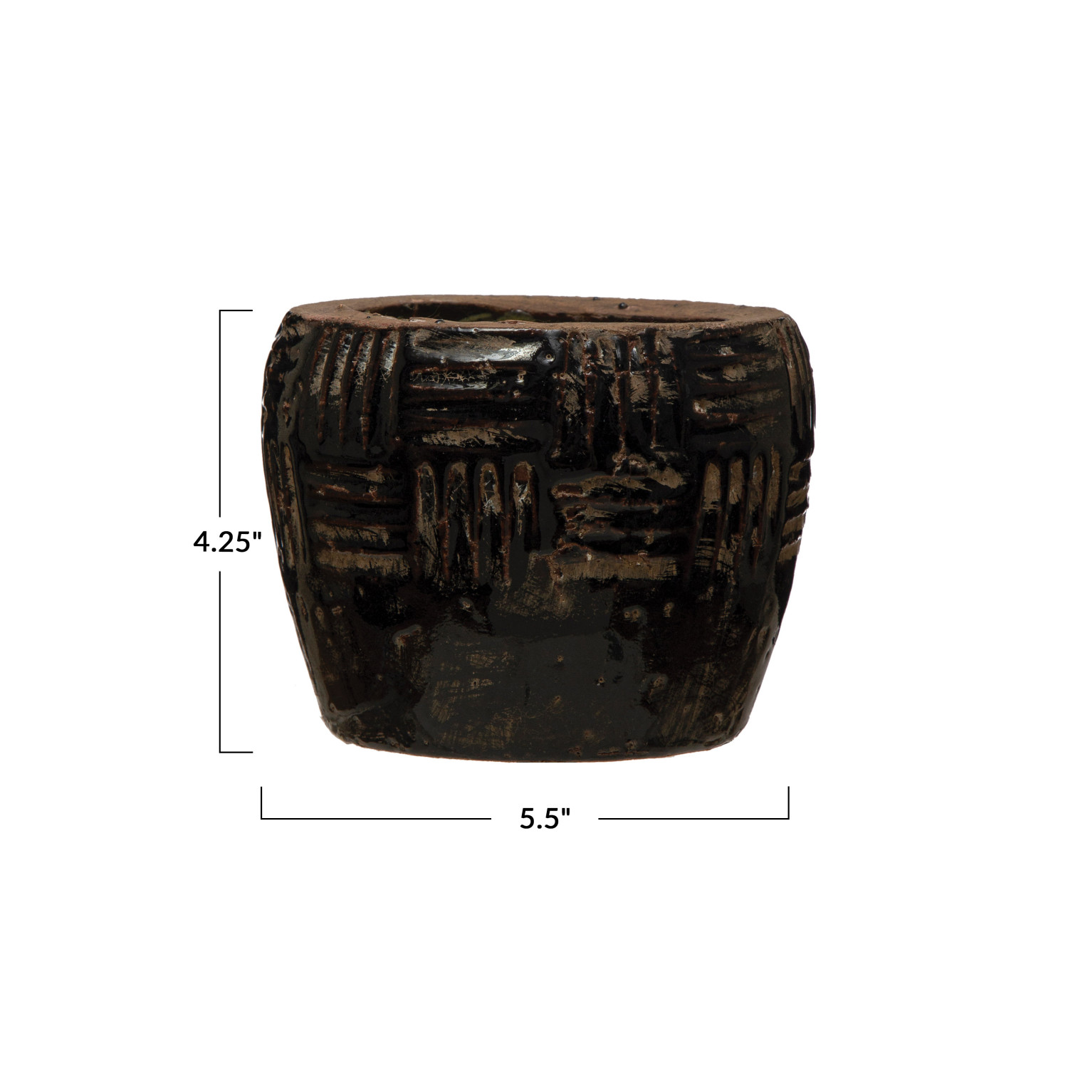 Catalog Name: 5-1/2" Round x 4-1/4"H Embossed Terra-cotta Planter, Crackle Finish, Distressed Black (Holds 4" Pot) (Each One Will Vary)