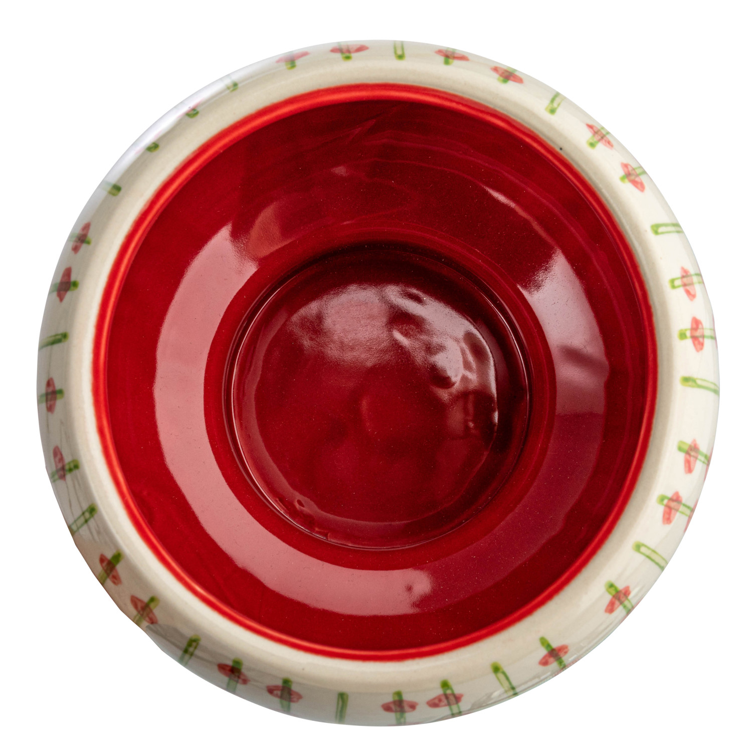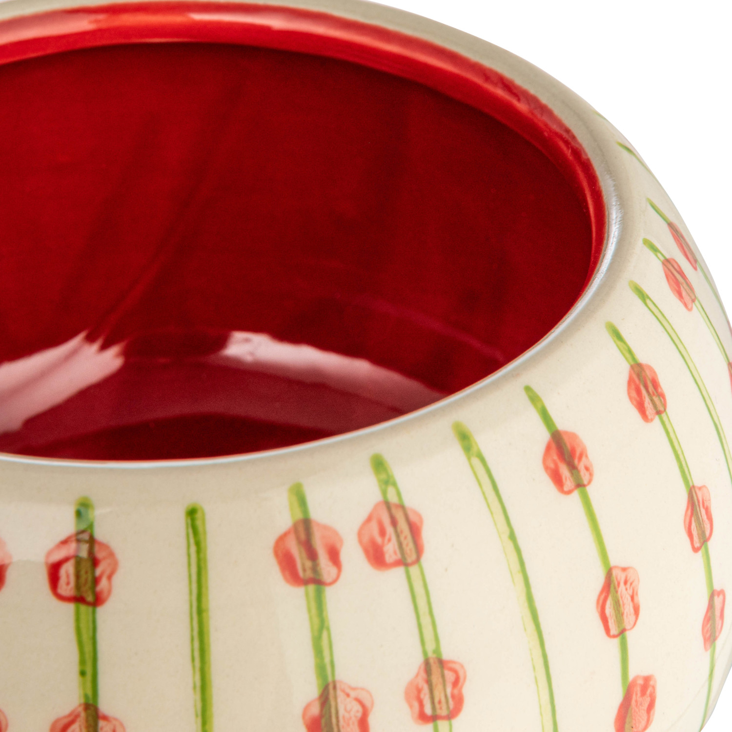 Catalog Name: 6-3/4" Round x 5-1/2"H Hand-Painted Stoneware Planter w/ Pattern, Cream Color, Green & Red