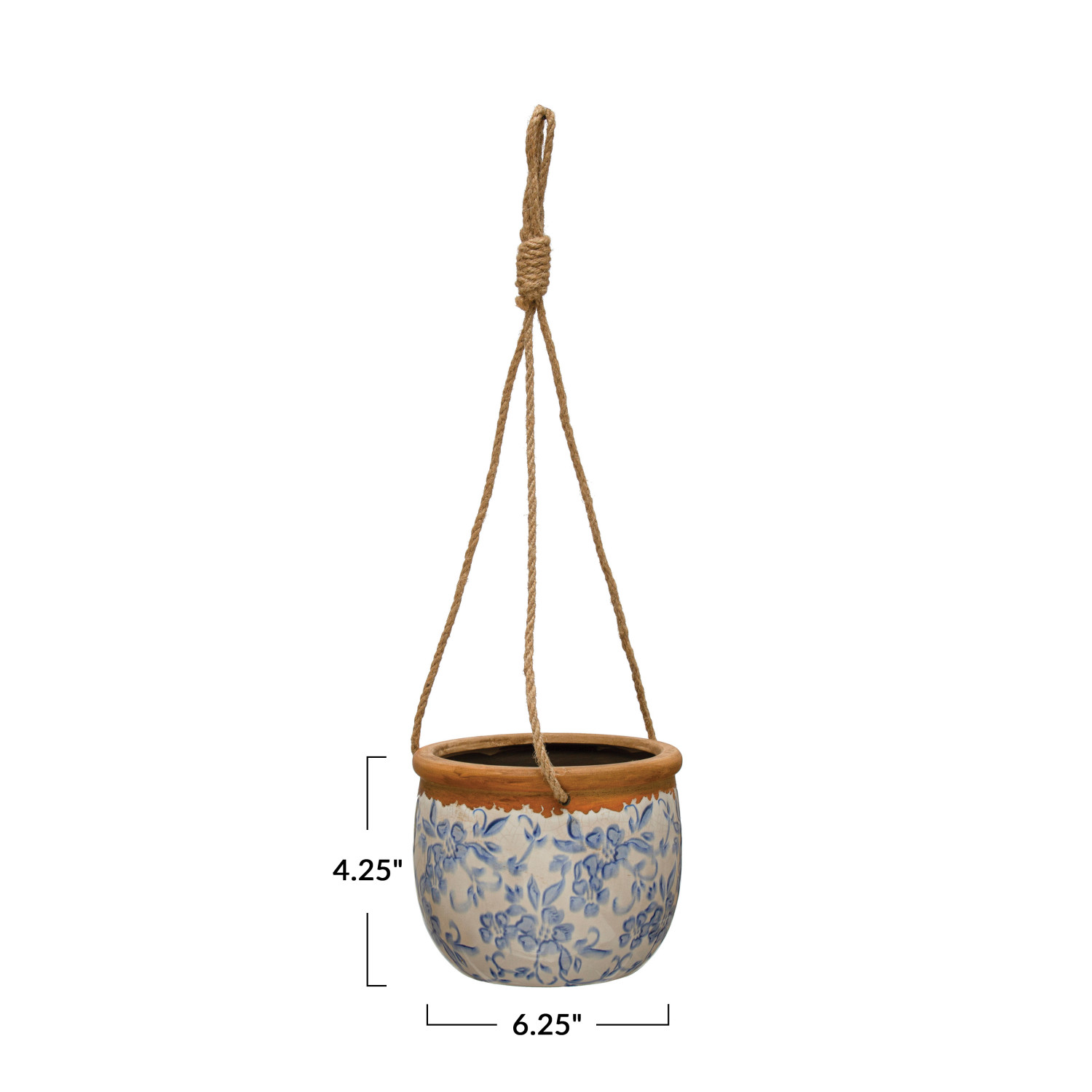 Catalog Name: 6-1/4" Round x 5-1/4"H Terra-cotta Hanging Planter w/ Florals & Jute Rope Hanger, Blue, White & Natural (Holds 3" Pot)