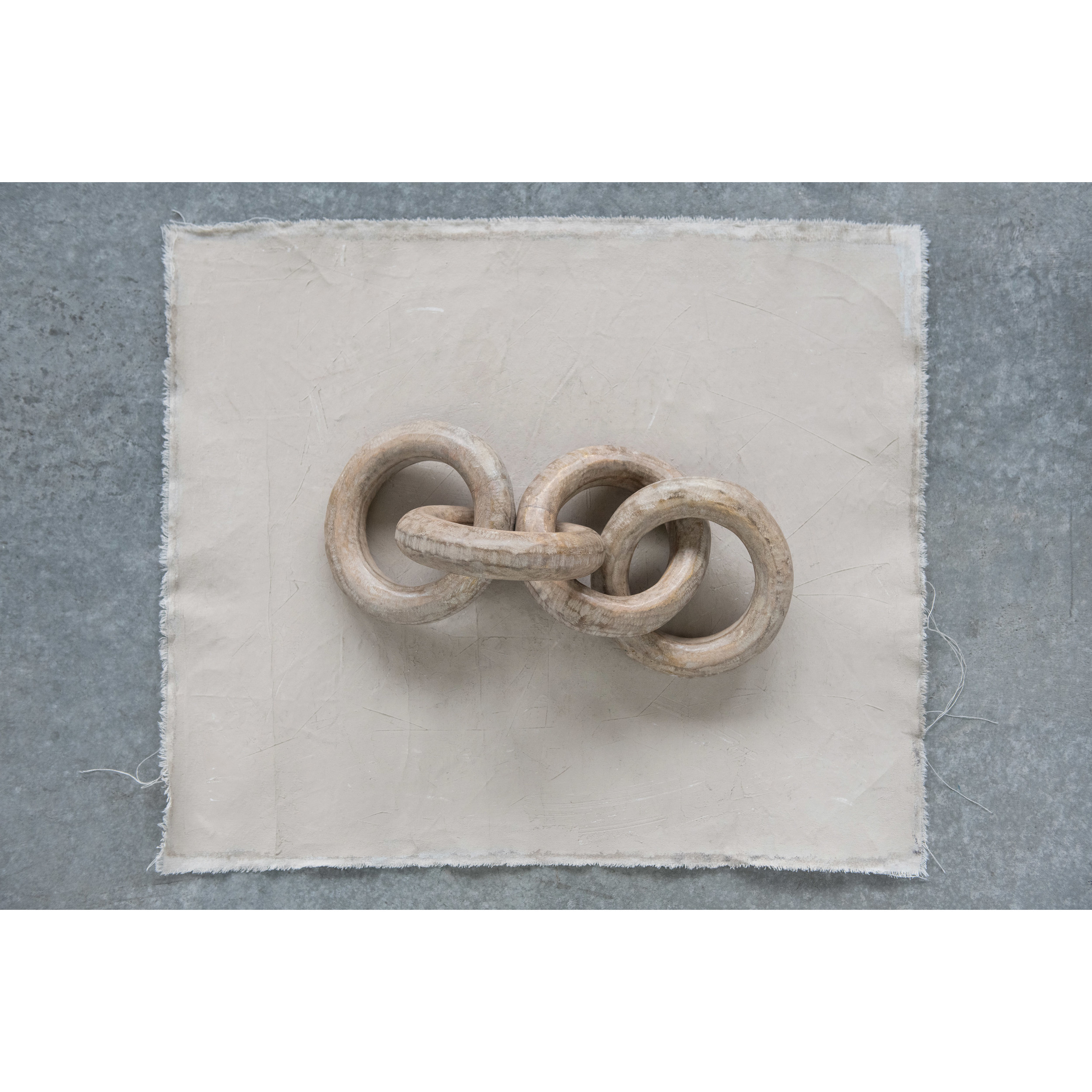 This carved chain is a must-have decorative piece for any home. Made out of mango wood, this carved chain features 4 rings and a soft, neutral coloring. This piece is perfect for adding depth to built in shelves, coffee tables, and hanging on any wall space.