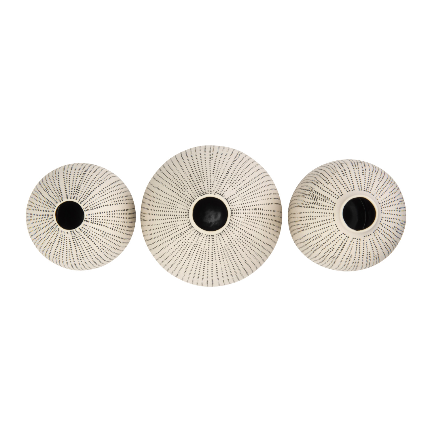 Catalog Name: 3-1/2" Round x 5-1/2"H, 4-3/4" Round x 4-3/4"H & 3-1/2" Round x 3-1/2"H Textured Stoneware Vases, White & Black, Set of 3