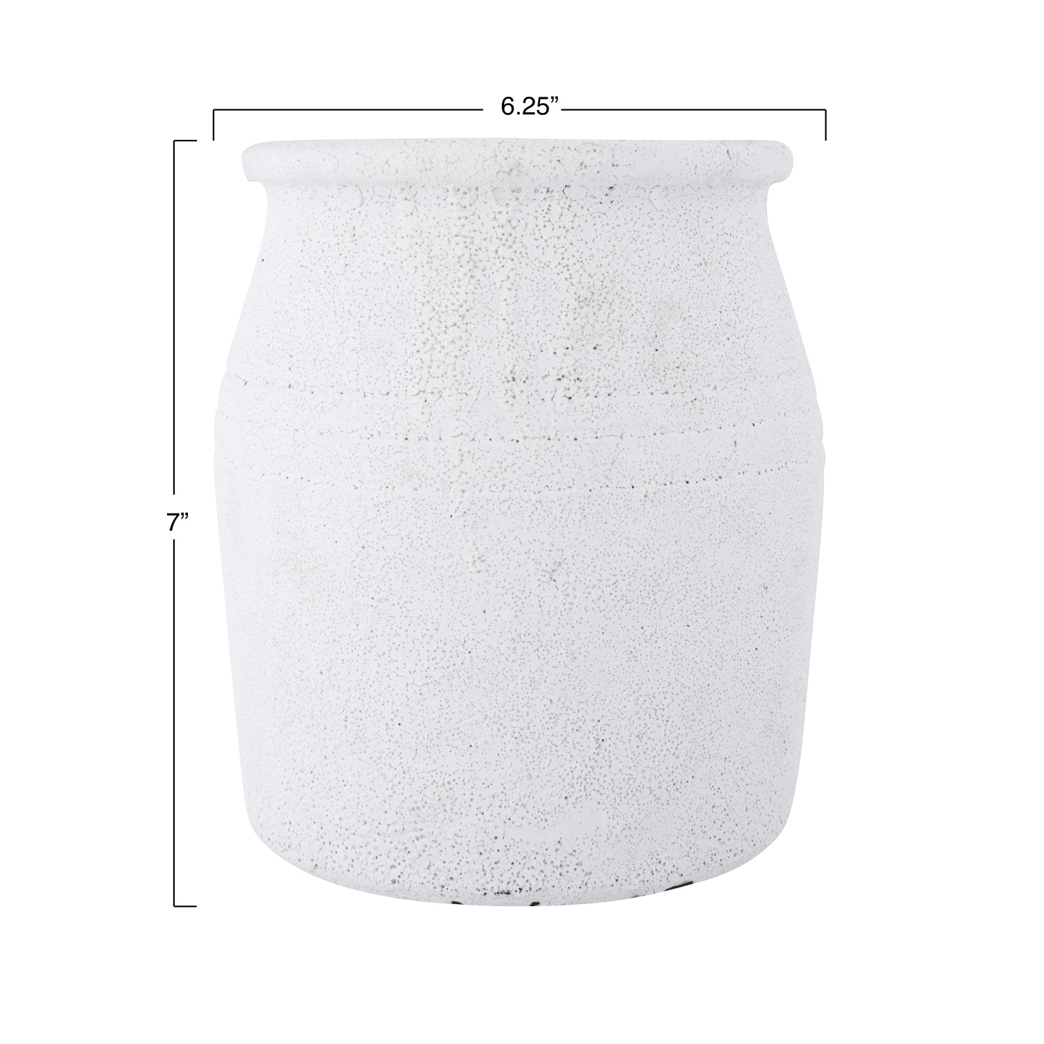 Catalog Name: 6-1/4" Round x 7"H Decorative Coarse Terra-cotta Crock, Volcano Finish, Distressed White (Each One Will Vary)