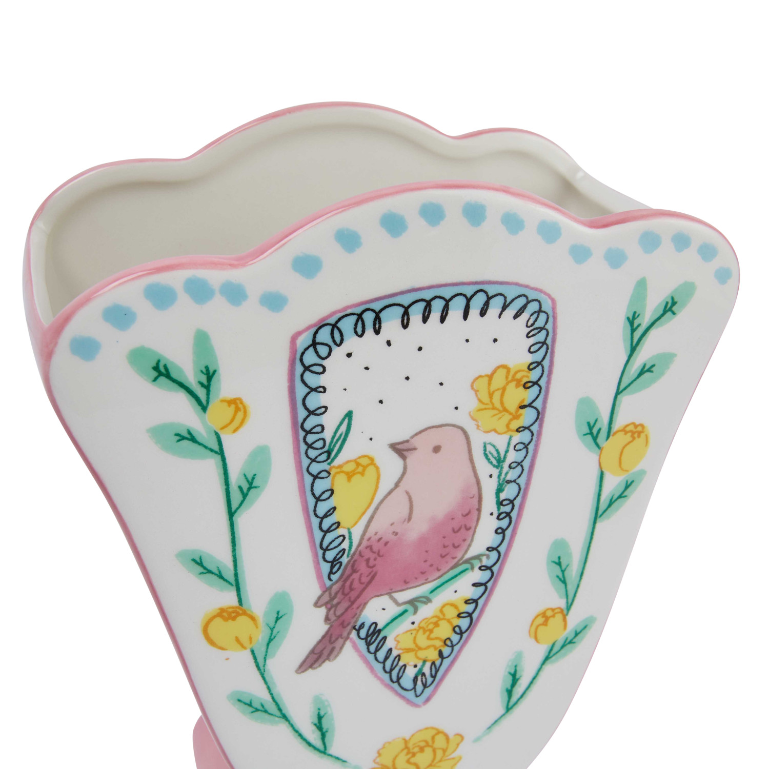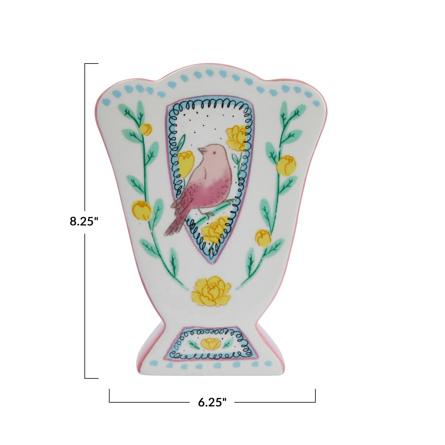 This lovely vase adds whimsy and charm to any home. The ceramic vase features a fan shape that creates a graceful and elegant silhouette. The vase also has a scalloped edge that adds some texture and detail to the design. The vase is adorned with a bird motif that showcases various colors such as green, pink, white, blue, and yellow. The vase does not have drainage holes, making it versatile for different uses. It can be used as a decorative vase for flowers, branches, or greenery. The vase is made of dolomite, a type of ceramic that is smooth, glossy, and durable. The vase measures 6.25 inches in length, 3.25 inches in width, and 8.25 inches in height, making it a sizable and beautiful piece that can fit in any space. Whether displayed on a mantel, shelf, table, or counter, this vase enhances the décor with its whimsy and charm. A lovely vase that features a fan shape, a scalloped edge, and a bird motif in multiple colors. Ideal for adding some whimsy and charm to the cottage, vintage, or shabby chic home décor. It can be used as a decorative vase for flowers, branches, or greenery. Made of dolomite.