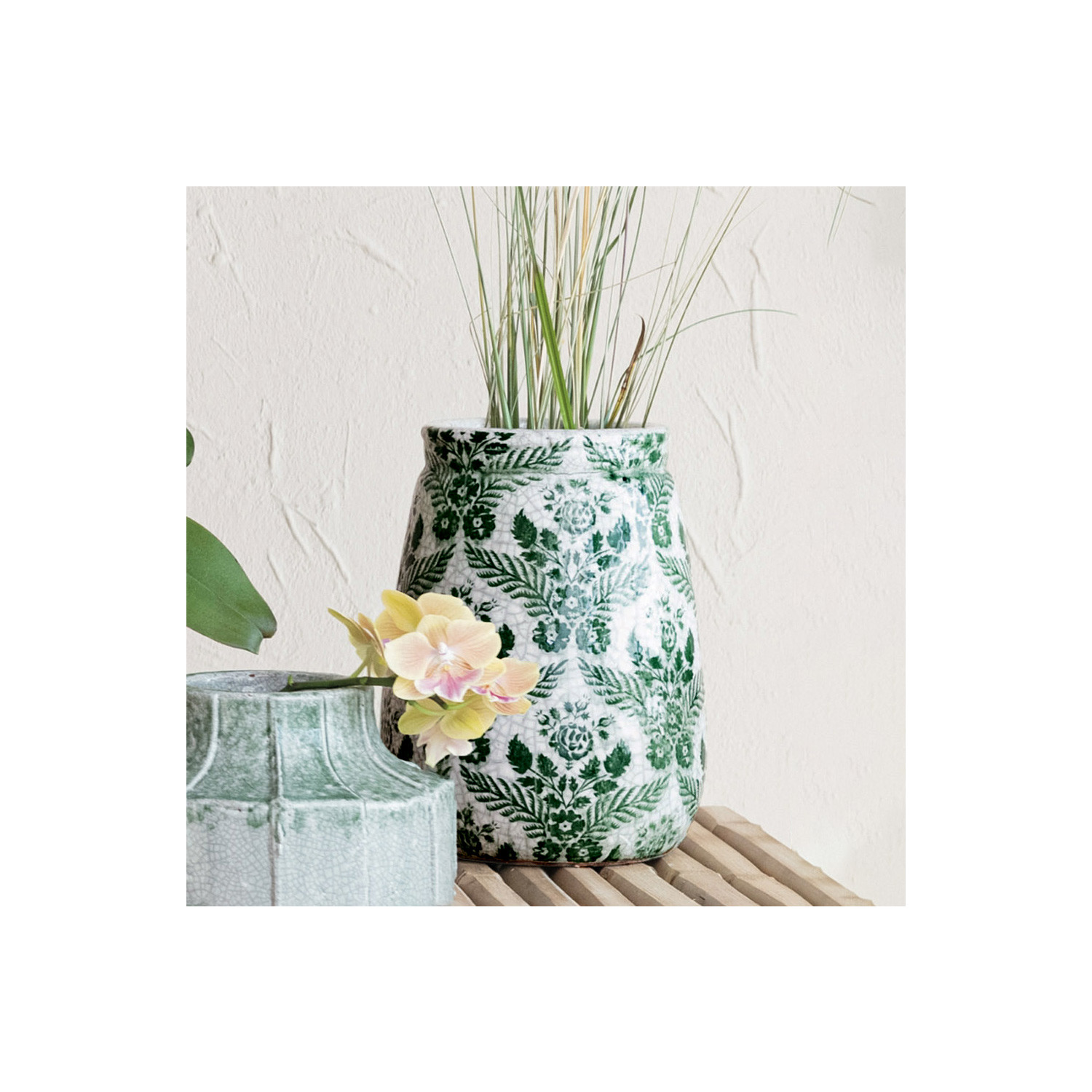 Catalog Name: 8" Round x 10-3/4"H Terra-cotta Planter/Vase w/ Transferware Pattern, Reactive Crackle Glaze, Green & White (Each One Will Vary)