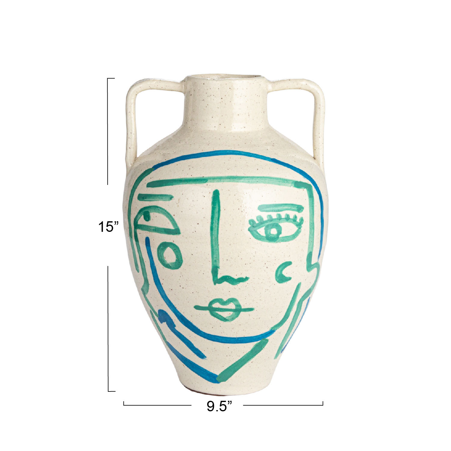 This hand-painted terra-cotta vase features an abstract face and crackle glaze in white, blue, and aqua colors. It is a unique and beautiful home accessory, made of baked clay with a porous and earthy texture. The vase has a round shape and wide opening, and its hand-painted design adds a playful and artistic touch. The crackle glaze creates a glossy surface, while the white, blue, and aqua color scheme adds a cozy and elegant look. This vase can be used to display fresh or artificial flowers, plants, or branches, or as a sculptural accent. Place it on tables, shelves, mantels, or windowsills, and create a cozy and inviting atmosphere in the home. It is suitable for farmhouse, coastal, French country, cottagecore, or boho style and adds personality and charm to any space. Truck shipping is required due to its size and weight.