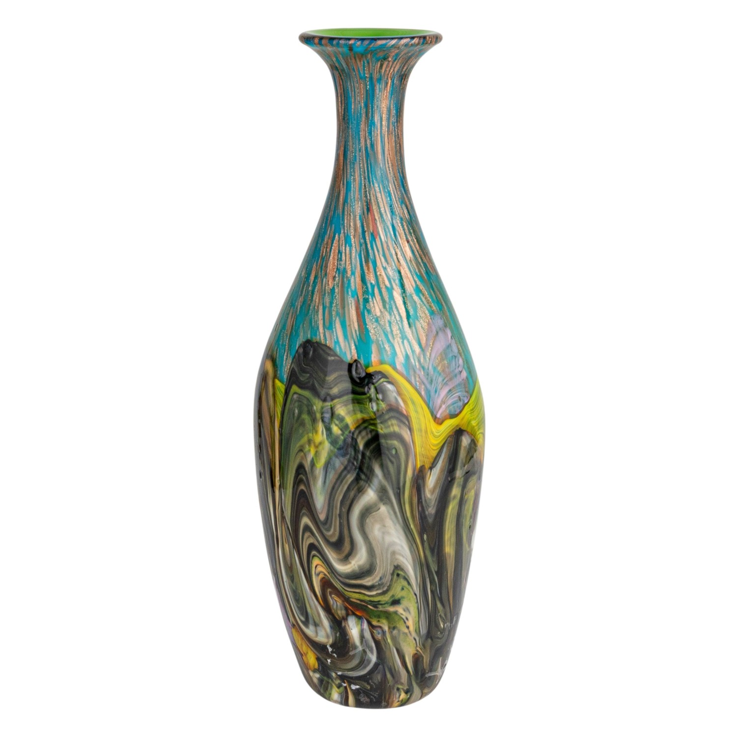 This handmade art glass vase is a testament to the beauty of skilled craftsmanship. The inclusion of gold glitter within the glass creates a shimmering effect that catches the light and the eye, making it a focal point in any setting. Its multi-colored design is reminiscent of a bohemian tapestry, while the narrow opening is ideal for displaying delicate floral arrangements. The vase's round form and considerable height offer a modern twist on traditional glassware, fitting seamlessly into various decor styles, from the laid-back coastal to the vibrant southwestern. It measures 6.25 inches in diameter and 18.75 inches in height, making it an elegant statement piece for any interior. It's not just a container for flowers; it's a piece of art that brings a touch of glamour and sophistication to the home.