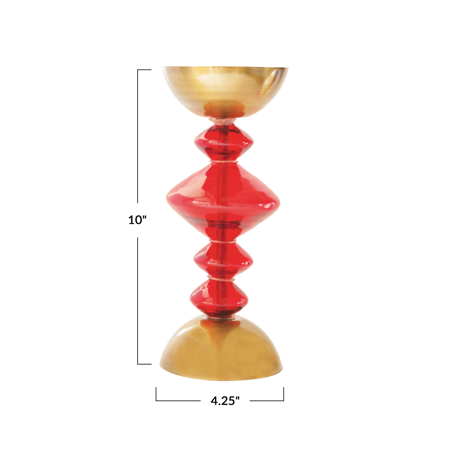 This glass and metal pillar holder is a testament to classic elegance with a modern twist. The rich red glass coupled with the antique gold finish creates a warm, inviting glow, perfect for intimate gatherings or as a luxurious addition to any home decor. Its round base and 10-inch height make it an ideal fit for 4-inch pillar candles, providing a stable and stylish platform that enhances the candle's natural beauty. Whether placed on a dining table as a centerpiece or on a sideboard as an accent piece, this pillar holder adds a touch of regal charm to any setting. An exquisite piece that captures the eye with its red glass and antique gold metal finish. A statement of elegance, this holder is a perfect centerpiece for mantels or festive tables. Ideal for indoor ambiance or as a dignified outdoor beacon on balmy evenings.