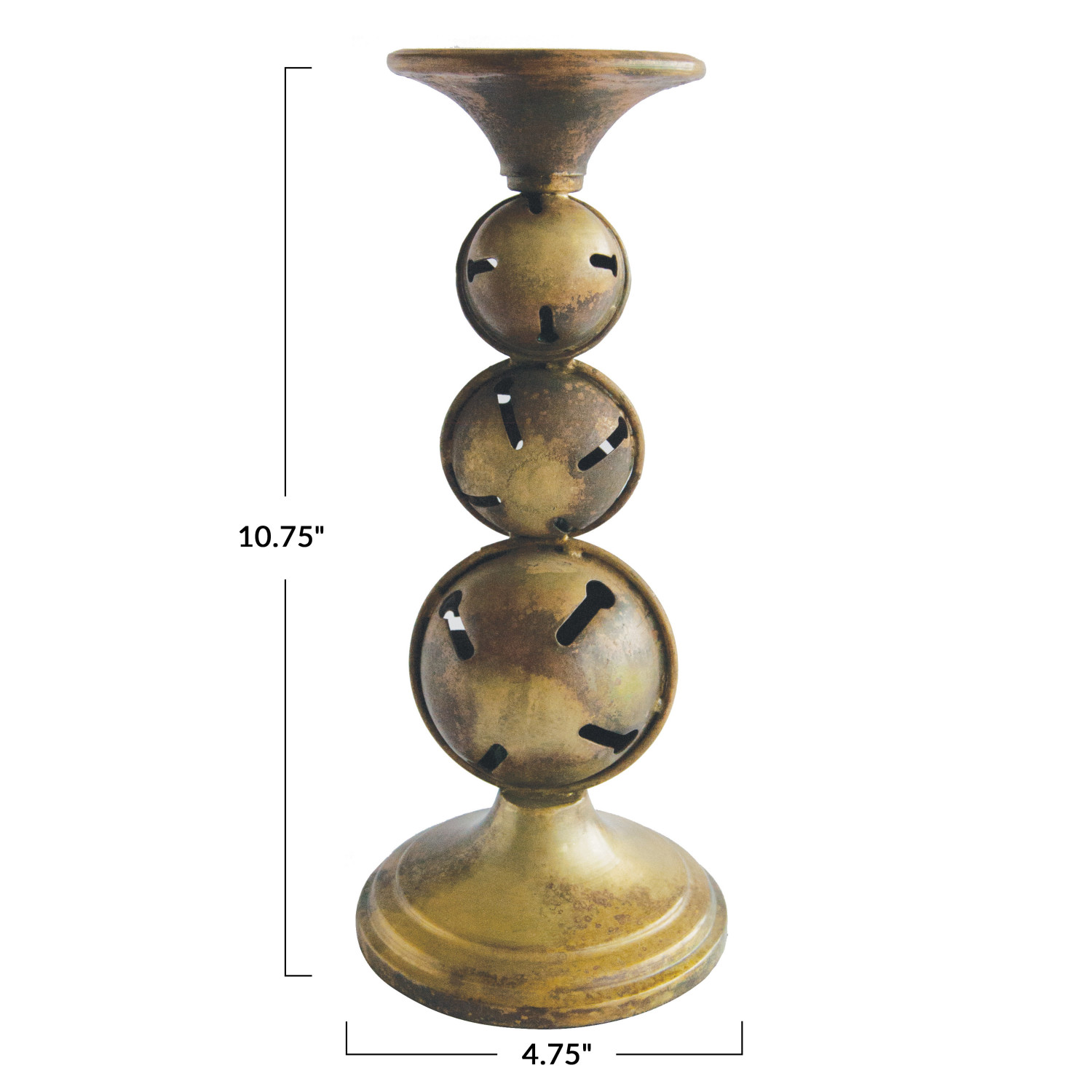 Catalog Name: 4-3/4" Round x 10-3/4"H Metal Candle Holder w/ Jingle Bell Base, Antique Brass Finish (Holds 3" Pillar) (Each One Will Vary)