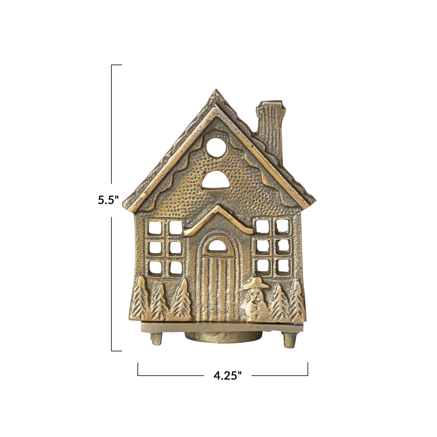 Catalog Name: 4-1/4"L x 2-1/4"W x 5-1/2"H Embossed Cast Aluminum House Tealight Holder, Antique Brass Finish