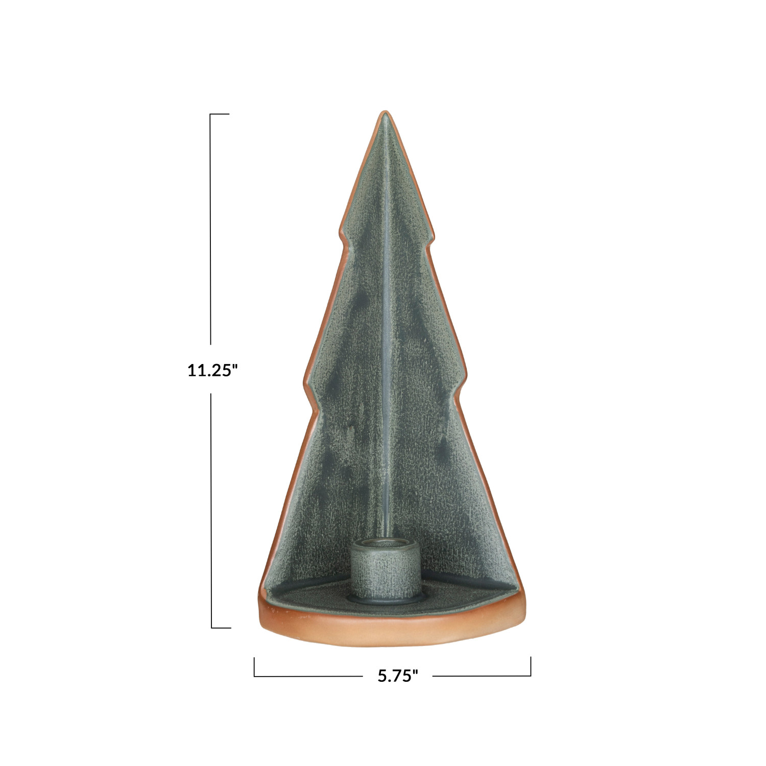 This stoneware tree taper candleholder is a fusion of natural beauty and artistic design. Standing at 11.25 inches tall, with a base 5.75 inches long and 5 inches wide, it's a significant presence in any room. The reactive glaze in shades of green, alongside the unglazed portions, gives each candleholder a one-of-a-kind look, ensuring that every piece is unique. Whether lit or unlit, it's a captivating addition to the decor. The intricate details of the tree branches and leaves add a touch of elegance to the overall design. Perfect for creating a cozy and inviting atmosphere in any home, this candleholder is sure to be a conversation starter among guests. A stately stoneware tree taper candleholder with a reactive glaze in verdant green, paired with unglazed sections for a rustic touch. An artistic addition that brings the tranquility of the forest into the home with its tree-like silhouette. Ideal for creating a peaceful ambiance, perfect for seasonal displays or as a year-round decorative element.