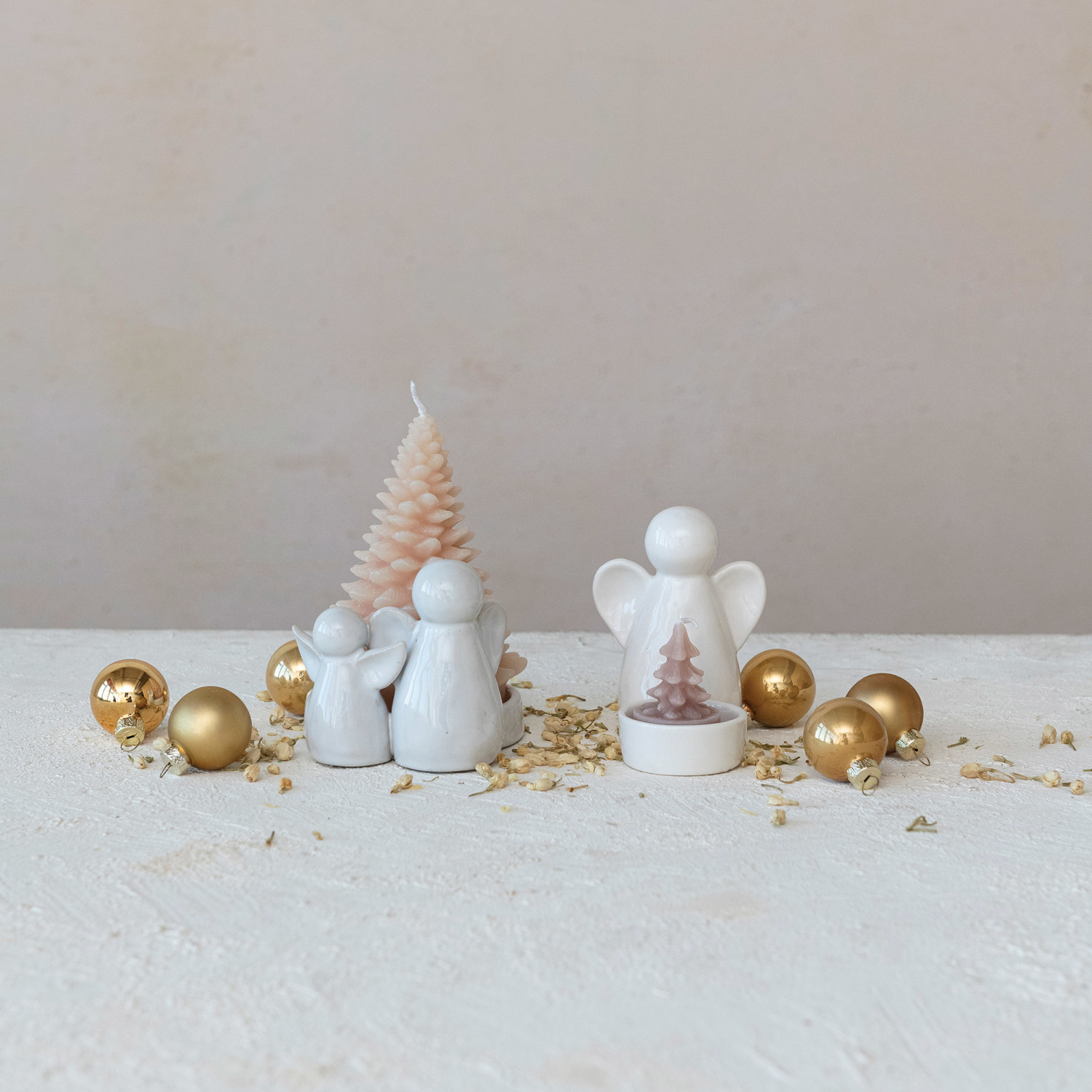 This stoneware angel pillar candleholder is a charming piece that combines spiritual symbolism with functional design. Its white hue and angelic shape add a touch of purity and calm to any setting, while its stoneware construction ensures durability. Measuring 4.5 inches long, 3.5 inches wide, and 3.5 inches high, it's sized to accommodate most pillar candles, casting a soft, soothing light that enhances the ambiance of any and every home. Whether used as a daily reminder of peace or as a special decorative element during the holidays, this candleholder is sure to inspire and delight. Its intricate detailing and elegant design make it a versatile piece that can complement a variety of decor styles. A serene angelic form in pure white stoneware, this candleholder brings a peaceful presence to any space. A divine addition to the decor, it pairs perfectly with soft-hued candles for a heavenly glow. Ideal for creating a tranquil corner or as a centerpiece during the festive season.