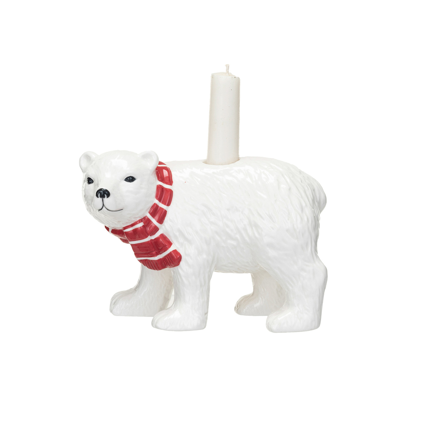 Catalog Name: 6"L x 3"W x 4-1/2"H Stoneware Polar Bear Taper Holder w/ Scarf, White & Red ©