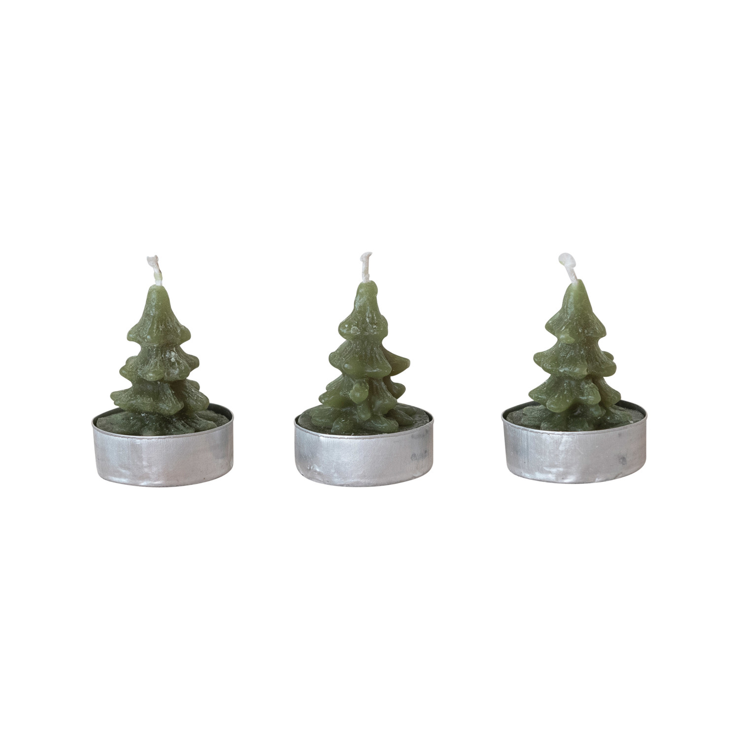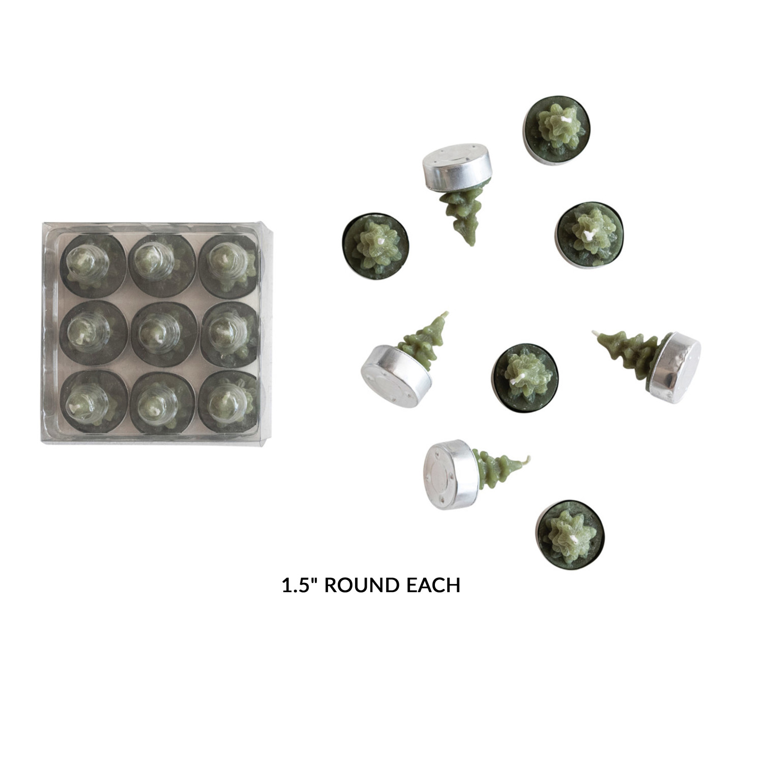 Catalog Name: 1-1/2" Round Unscented Tree Shaped Tealights in Box, Pewter Color, Set of 9 (Approximate Burn Time 3 Hours)