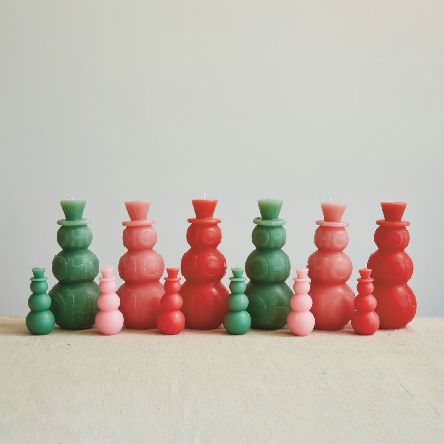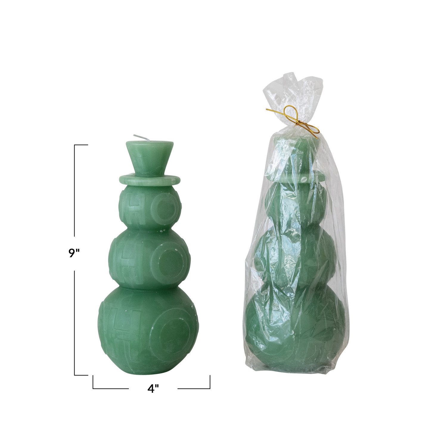 Catalog Name: 4" Round x 9"H Unscented Snowman Shaped Pillar Candle "Ho Ho Ho", Green (Approximate Burn Time 120 Hours)