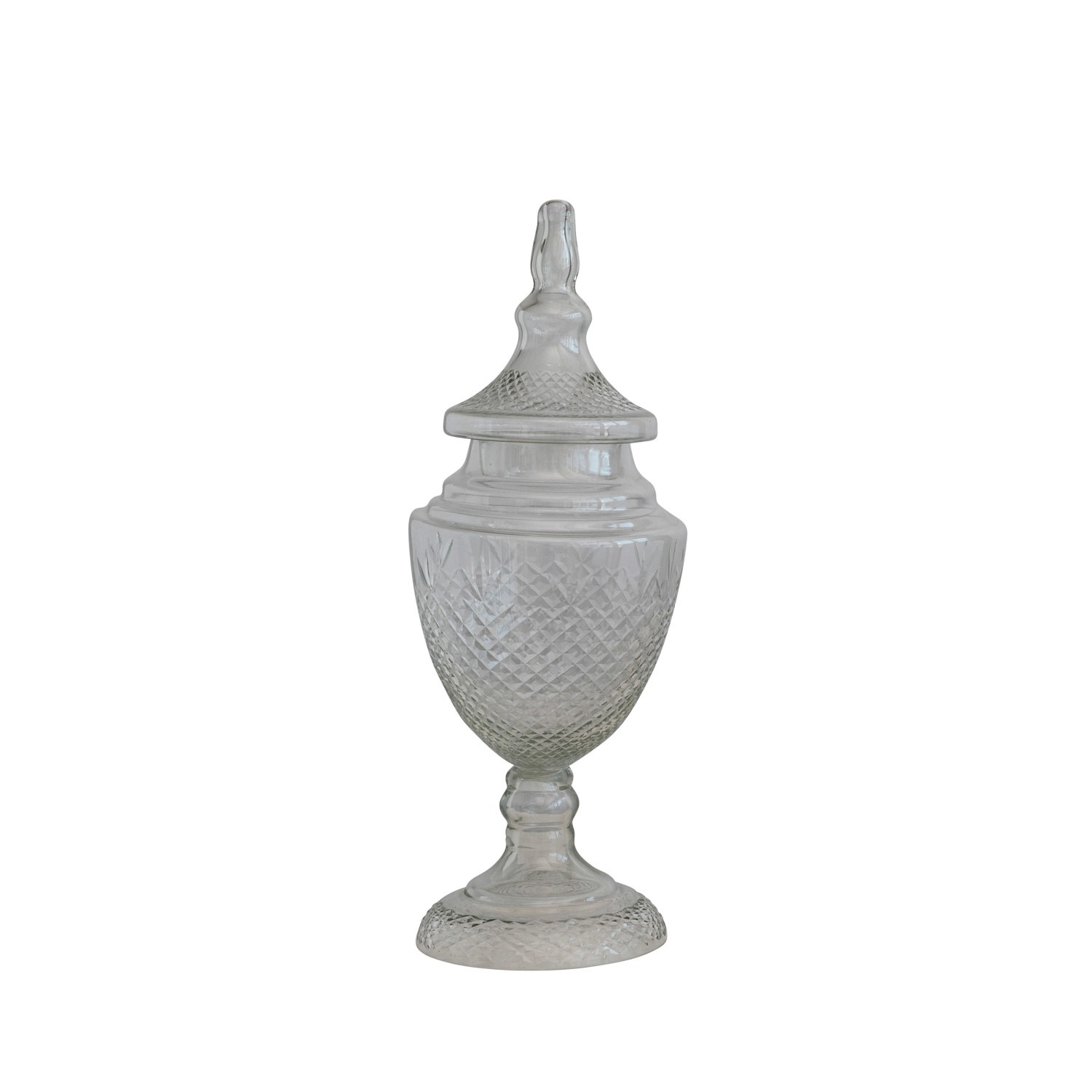 This cut glass apothecary jar is a sophisticated way to display holiday candies or small trinkets. Add a touch of magic to holiday displays with our stunning collection of decorative accents, including charming trays, elegant pedestals, and delightful baskets, featuring festive designs, perfect for celebrating the season in style.