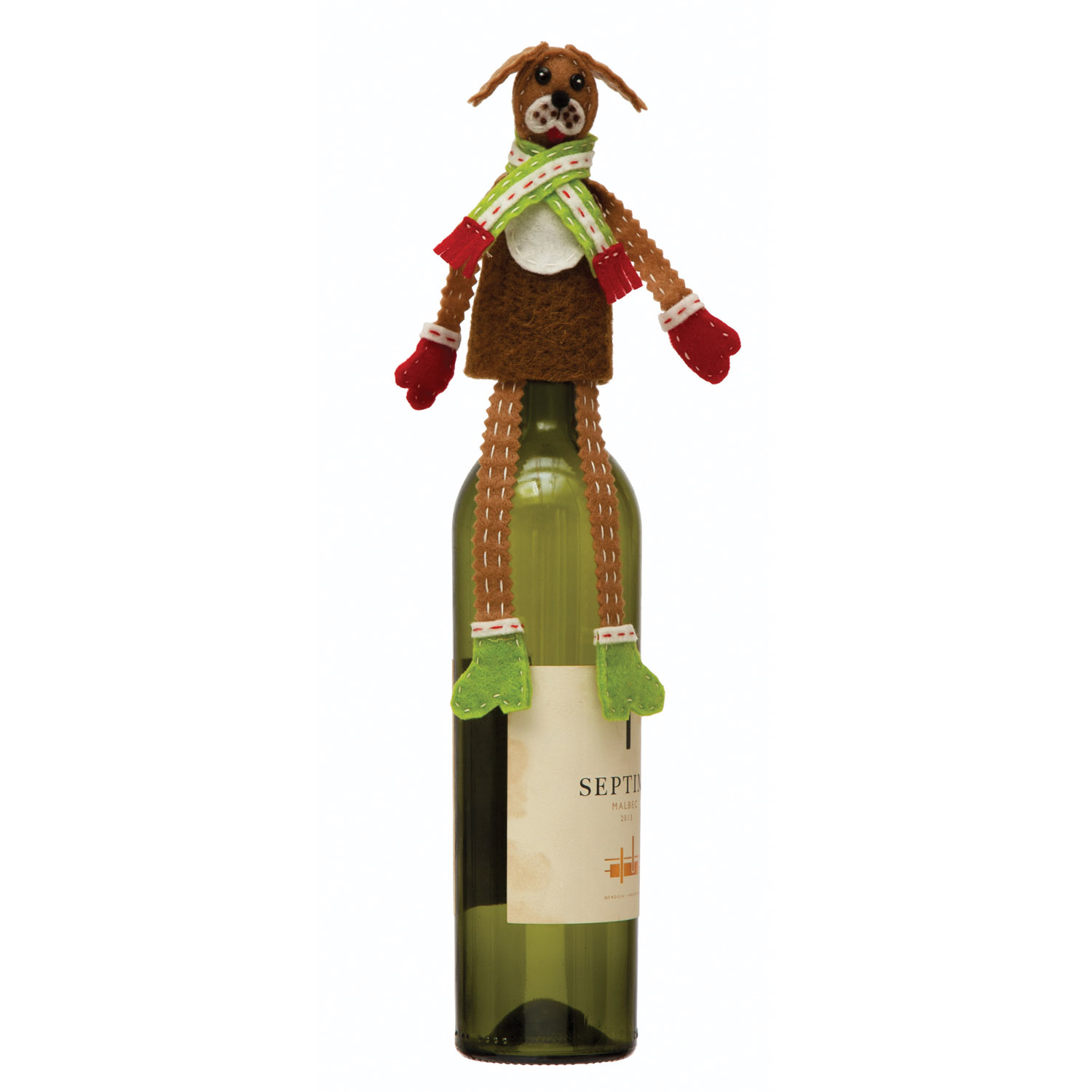Catalog Name: 10"H Handmade Fabric and Wool Felt Dog in Scarf Bottle Topper with Embroidery and Applique, Multi Color