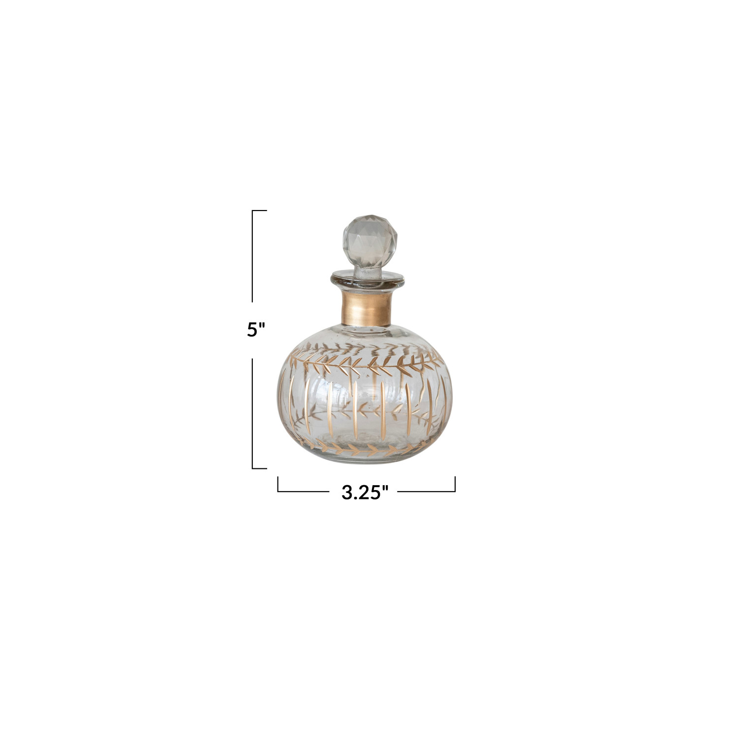 Catalog Name: 3-1/4" Round x 5"H 10 oz. Etched Recycled Glass Mini Decanter w/ Gold Finish Pattern & Stopper